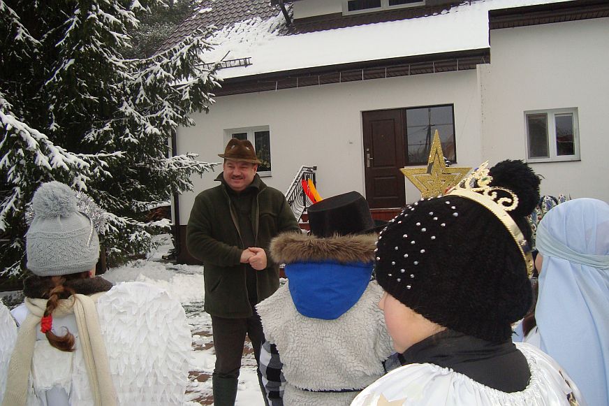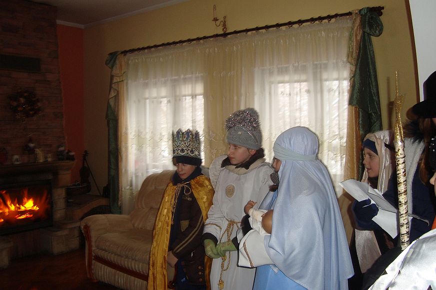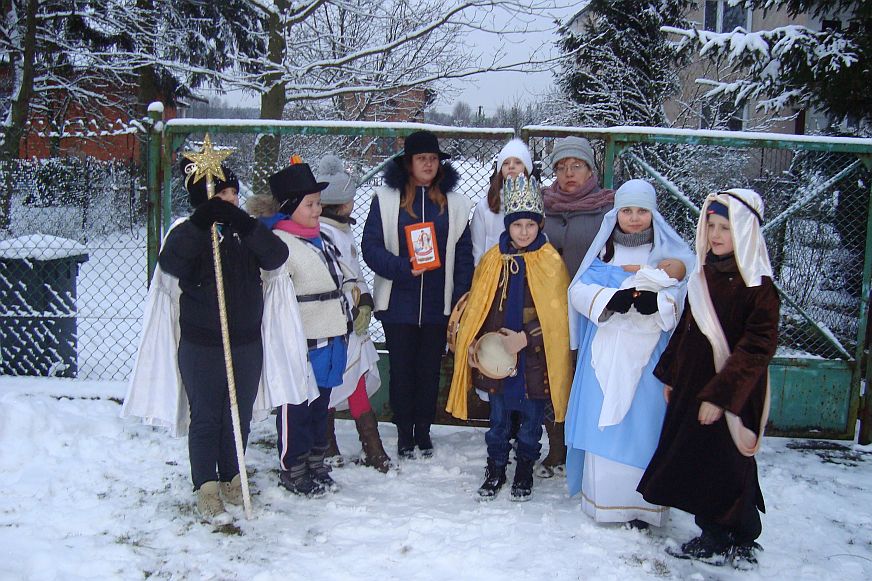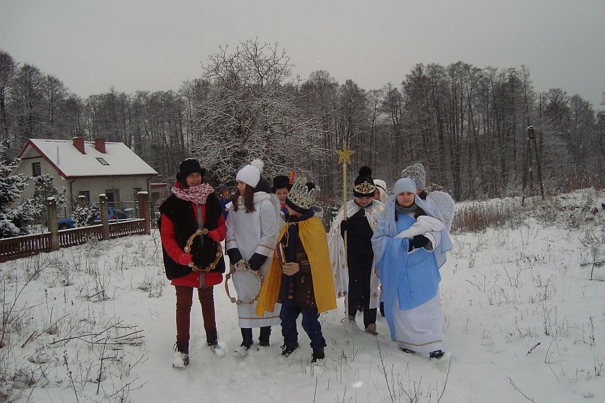 Grupa kolędnicza to: Klaudia Łuczak - Matka Boża, Gabriel Szymkiewicz - św. Jozef, Julia Podkańska - pasterz, Wiktoria Krukowska - pasterz, Jakub Sandurski - pasterz, Kinga Pacholec - gwiazda, Zuzanna Psiurska - anioł, Julia Stawnicka - anioł, Adam Kijek - król.