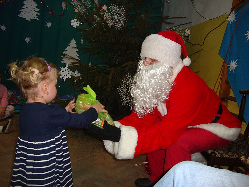 Po obejrzeniu bajki Mikołaj obdarował artystów, uczniów Szkoły Filialnej w Soczewce i zgromadzone, młodsze dzieci prezentami (zakupionymi przez Radę Rodziców), a następnie wszyscy udali się na poczęstunek przygotowany przez rodziców.