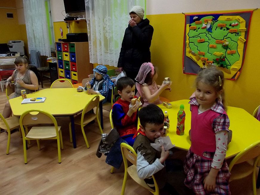 Chwilę odpoczynku zapewnił słodki poczęstunek; jak na „tłusty” czwartek przystało był to pączek i soczek przygotowany przez Radę Rodziców.
