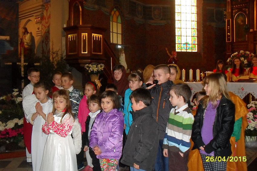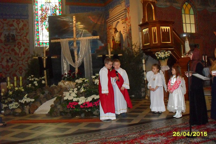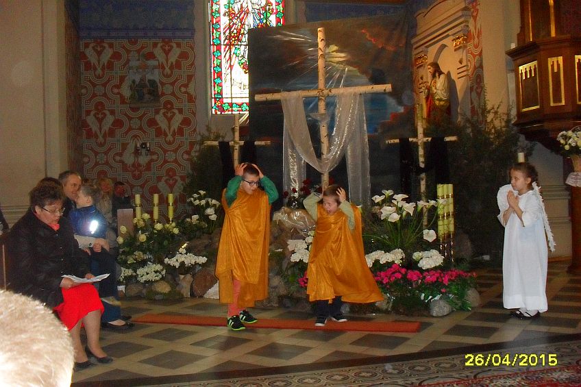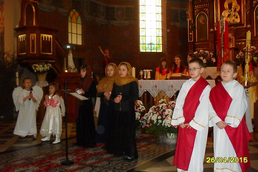 Nasze szkolne przedstawienie wielkanocne wystawiliśmy 26 kwietnia w kościele parafialnym w Soczewce. Dzieci pięknie wcieliły się w rolę Apostołów, niewiast idących do grobu i aniołów, a schola parafialna śpiewała pieśni wielkanocne. Uczniowie występowali przy Grobie Pańskim, dzięki czemu ich gra aktorska pięknie oddała treści związane z tajemnicą Zmartwychwstania. Bardzo licznie zgromadzeni parafianie nagrodzili występ naszych uczniów gromkimi brawami. Za swoje zaangażowanie i grę aktorską dzieci dostały słodkie upominki i podziękowanie od księdza Proboszcza Marka Kardasza.