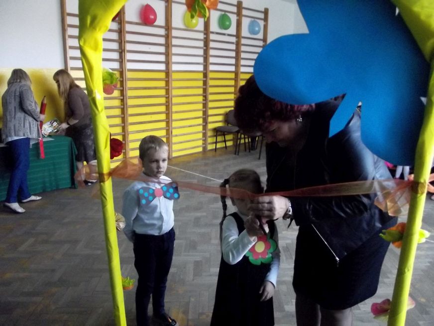 Pani Dyrektor wspólnie z dziećmi przecięła wstęgę zawieszoną w symbolicznych drzwiach przedszkola. Dzieci kolejno przechodziły przez te drzwi a Pani Dyrektor wielkim ołówkiem pasowała je przedszkolaków, mówiąc: "Pasuję Cię na dzielnego i wesołego przedszkolaka". Po czym dzieci otrzymały pamiątkowe dyplomy i prezenty.