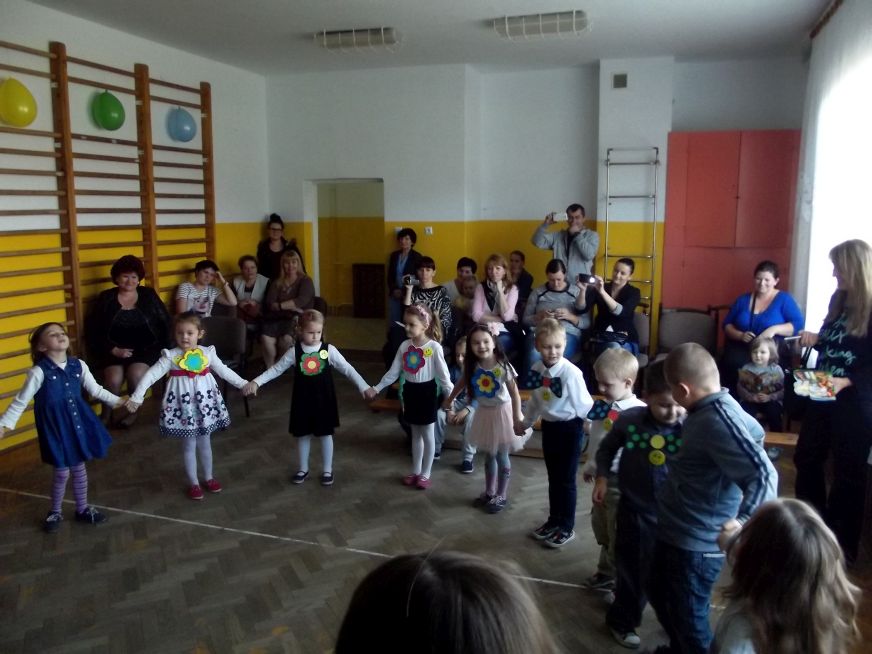W drugiej części uroczystości zaproszono chętnych gości do wspólnych zabaw ruchowych ze śpiewem, typu: "Stary niedźwiedź, Ulijanka, Jedzie pociąg, Mam chusteczkę haftowaną, Jadą misie, Kółko graniaste, Siła baba mak". Wszyscy wesoło się bawili, bo są to znane zabawy naszych babć i dziadków.