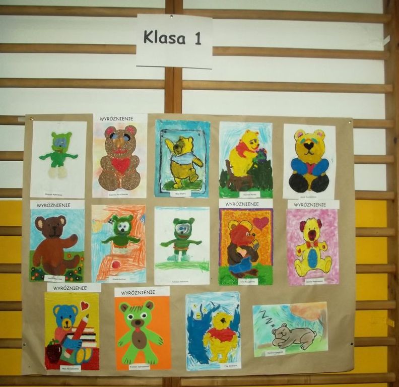 Piękne prace uczestników konkursu wykonane przeróżnymi technikami plastycznymi wyeksponowane na gazetce ściennej tworzyły scenografię „Krainy Pluszowego Misia”.