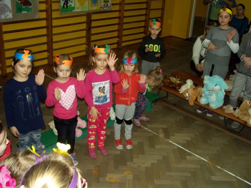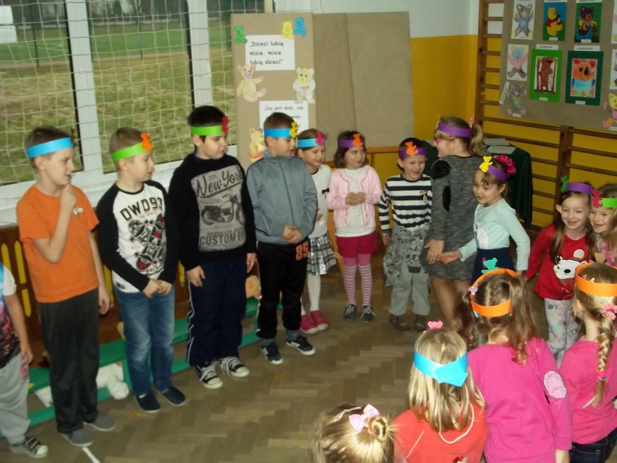 Dzieci w tym dniu przyniosły swoje misie- pluszaki, włożyły misiowe opaski na głowę i zostały zaproszone do wspólnej zabawy.
