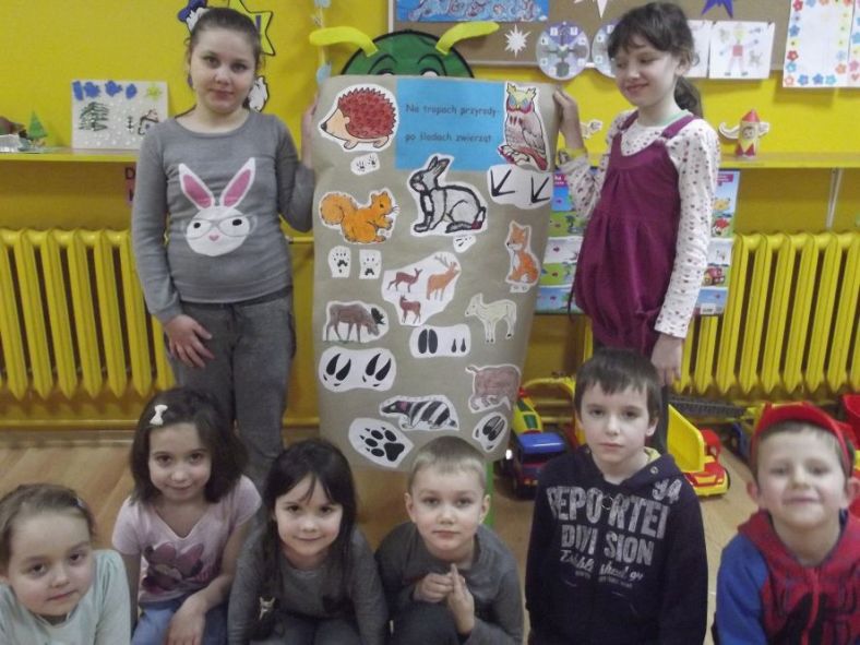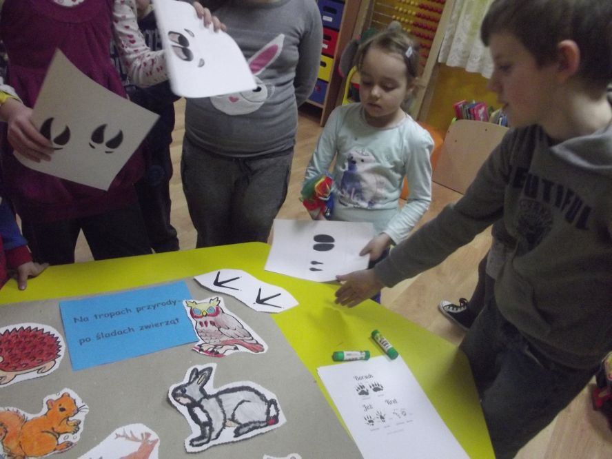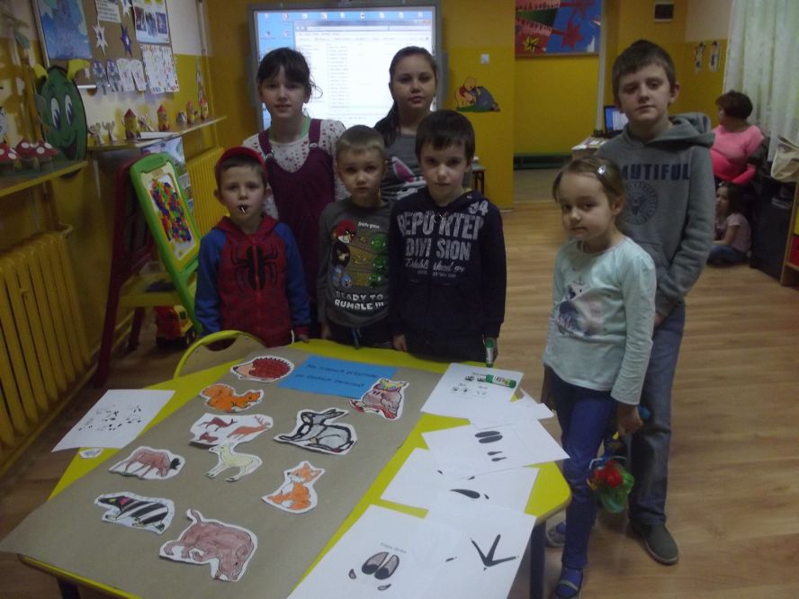 Chociaż zima splatała figla i na ferie nie było śniegu, to i tak udało nam się zrealizować wcześniej zaplanowane zajęcia „Na tropach przyrody- po śladach zwierząt”. Na początku dzieci obejrzały prezentacje multimedialną „Zwierzęta zimą” z wykorzystaniem tablicy interaktywnej. Następnie poprzez zabawę rozpoznawały i nazywały różne zwierzęta oraz dobierały, dopasowywały ślady i tropy tych zwierząt. Na koniec bawiły się w kolorowanie sylwet zwierząt. I tak powstała wystawka, którą mogą oglądać wszyscy uczniowie.