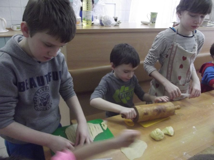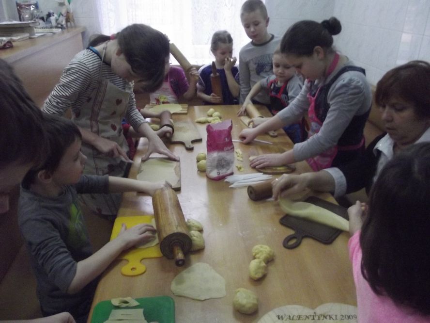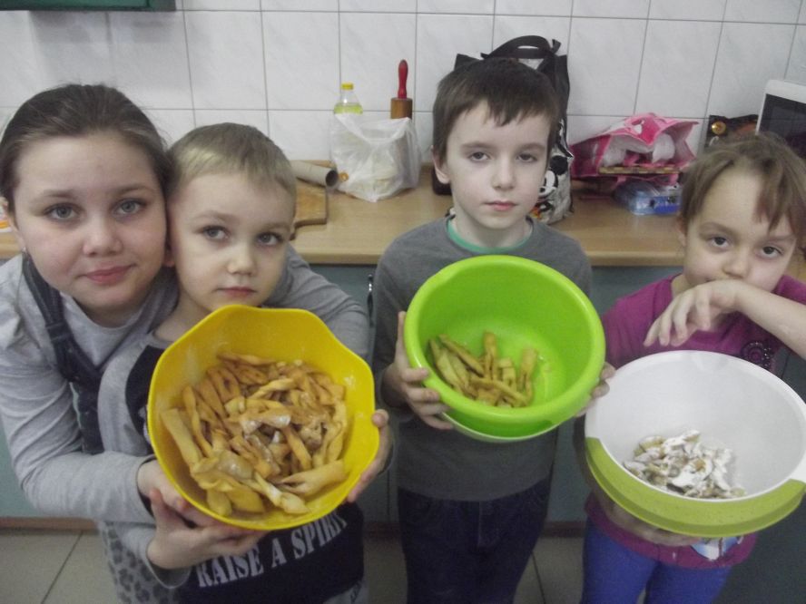 Jak karnawał, to faworki. Każde dziecko z przyniesionych składników (według wcześniej przygotowanego przepisu) piekło swoją porcję faworków. W szkolnej kuchni wrzało z podniecenia. Dzieci według przepisu wrzucały do miski składniki, a potem zagniatały, zagniatały, …, aż ciasto było dobre. Potem wałkowanie porcji, krojenie i najgorsze – przeciąganie pasków. Nie każdemu się udawało. Gotowe faworki trafiały na tłuszcz. Jeszcze tylko cukier puder i gotowe. Upiekliśmy ponad 300 faworków. Niewiele z nich trafiło na poczęstunek do domów. Były tak pyszne, że większość zjedliśmy na miejscu. Mniam.