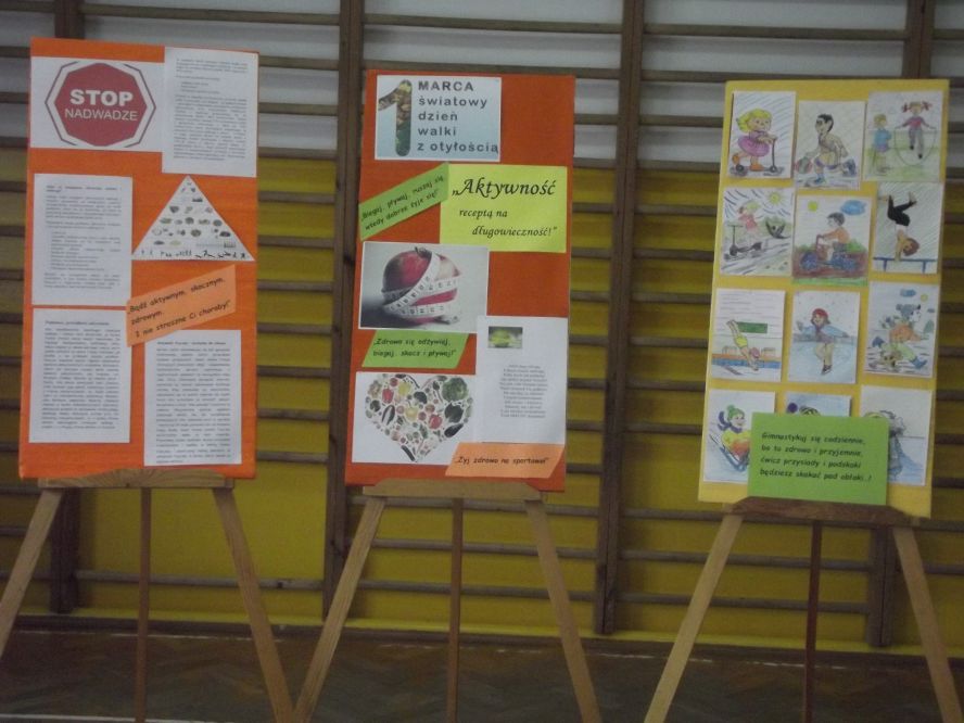 W tym dniu na korytarzu szkolnym pojawiły się kolorowe gazetki informacyjne promujące zasady prawidłowego odżywiania i aktywność ruchową, a rysunki zachęcające do uprawiania różnych sportów wykonali uczniowie klasy 1.
