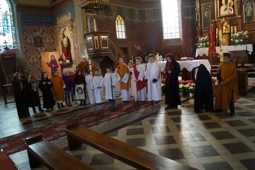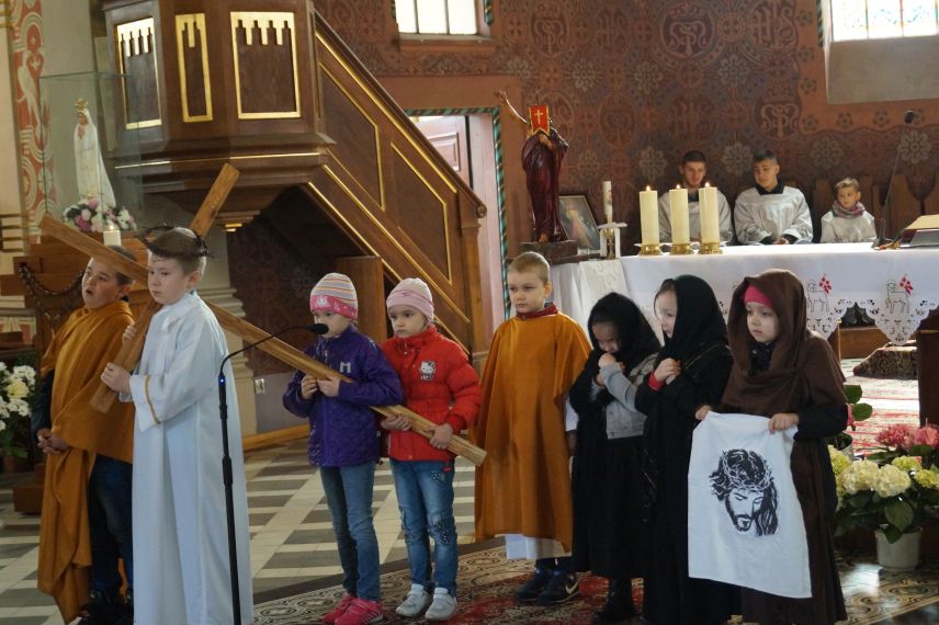 Uczniowie Szkoły Filialnej w Soczewce dn.17.04.2016r. wystawli w kościele parafialnym przedstawienie o męce , śmierci i zmartwychwstaniu Jezusa Chrystusa . Oprawę muzyczną zapewniła schola parafialna pod kierunkiem p. Ireneusza Araszewskiego . Występ uczniów obejrzeli licznie zebrani parafianie oraz goście , którzy przybyli na przedstawienie .Gra aktorska uczniów z kl .0-III wywarła duże wrażenie na zebranej publiczności , gdyż zostali oni nagrodzeni gromkimi brawami .