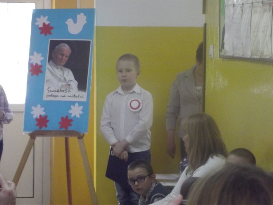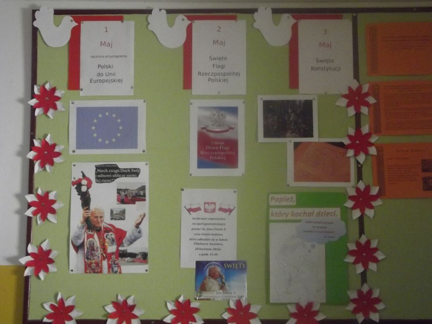 W Szkole Filialnej w Soczewce 28 kwietnia 2016r. odbyły się uroczyste obchody Świąt Majowych oraz oddanie hołdu Janowi Pawłowi II w związku z rocznicą kanonizacji naszego Rodaka. W tym dniu został zorganizowany uroczysty apel, w który zaangażowały się dzieci z kl. 0-III, pod kierunkiem p. Jolanty Kacprzak i p. Renaty Podkańskiej. Przygotowany montaż słowno-muzyczny przybliżał postać świętego Jana Pawła II. Przypomnieliśmy sobie wzniosłe i wyjątkowe słowa ukochanego Ojca Świętego. Mali wykonawcy zaśpiewali również znaną pieśń „Barka„ jako podziękowanie dla Tego, który zawsze nam wskazywał drogę ku temu, co piękne i dobre. W coroczny kalendarz uroczystości naszej Szkoły jest wpisany apel z okazji Rocznicy Uchwalenia Konstytucji 3 Maja. Ten dzień jest wspaniałą okazją, by uzmysłowić rolę i znaczenie takich słów jak Ojczyzna i Patriotyzm. Głównym celem apelu było wyrobienie wśród dzieci postaw szacunku do dziedzictwa kulturowego, historycznego i tradycji narodowych. Cieszymy się więc wolną Polską i tym, że możemy z dumą patrzeć na polską flagę i śpiewać hymn.