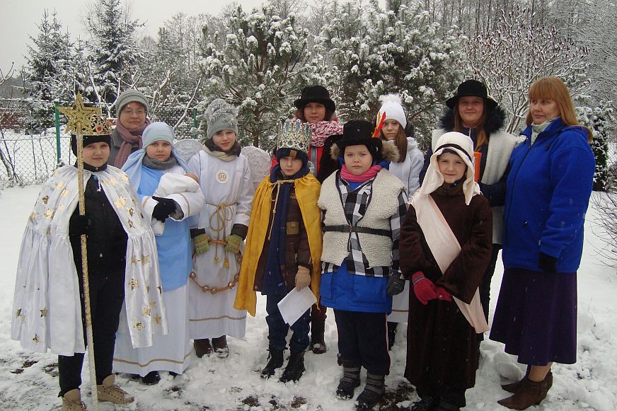 Grupa kolędnicza to: Klaudia Łuczak - Matka Boża, Gabriel Szymkiewicz - św. Jozef, Julia Podkańska - pasterz, Wiktoria Krukowska - pasterz, Jakub Sandurski - pasterz, Kinga Pacholec - gwiazda, Zuzanna Psiurska - anioł, Julia Stawnicka - anioł, Adam Kijek - król.