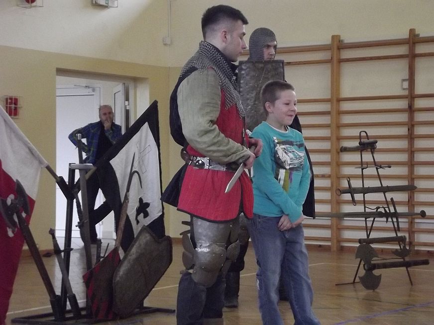 Po pokazie dzieci mogły obejrzeć różne rodzaje broni, a także zbroję rycerską. Każdy mógł wziąć do ręki berło, miecz, tarczę, maczugę, buzdygan, nałożyć hełm na głowę, a nawet stanąć do walki z prowadzącymi. Nie brakowało chętnych uczniów do zakuwania w dyby.