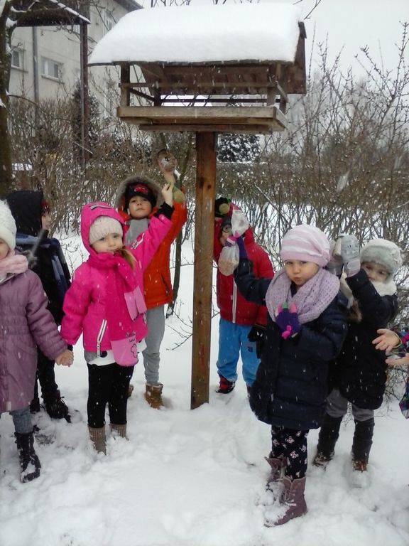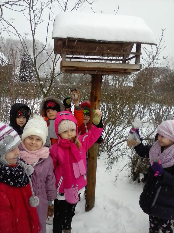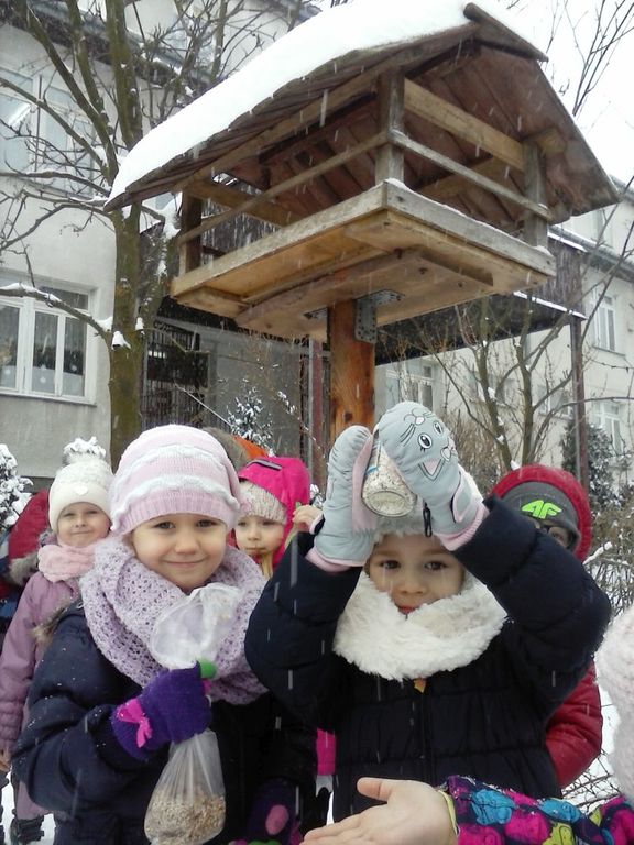 Od kilku dni panują mrozy i pada śnieg, dlatego ptaki potrzebują naszej pomocy. Jeszcze zanim nadeszły pierwsze mrozy, przedszkolaki z klasy 0b gromadziły pokarm dla swoich skrzydlatych przyjaciół. Odpowiednio przygotowani pod opieką p. Marzeny Markiewicz i p. Doroty Sudomir, ruszyły z akcją pomocy do ptasich stołówek wokół naszej szkoły. Ptaki odwdzięczą się wiosną i latem pięknym śpiewem, a dzieci zapewniają, że ptasie stołówki będą zaopatrywać przez całą zimę.
