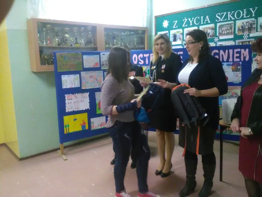 Podczas podsumowania gminnego etapu konkursu strażackiego: „Młodzież zapobiega pożarom”, wręczenia nagród dokonali: Prezes OSP w N. Duninowie – druh Ryszard Kołodziejski i druhna Joanna Salamądra - OSP w Lipiankach.