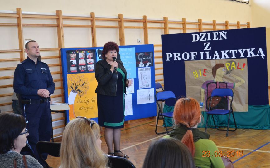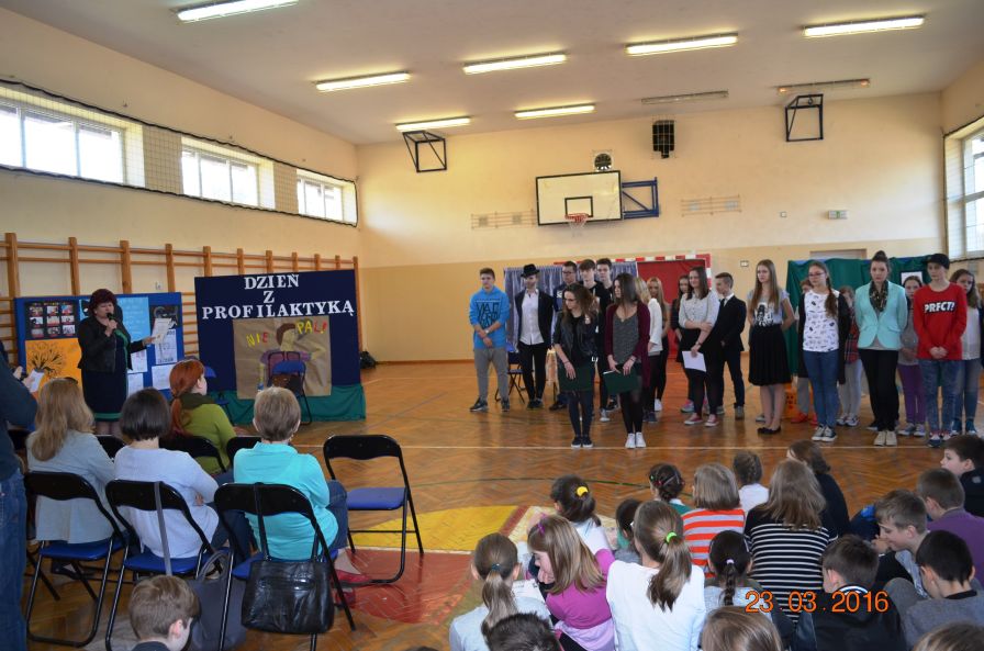 W ramach działalności profilaktycznej szkoły w zakresie uzależnień dnia 23 marca 2016R. w Zespole Szkół w Nowym Duninowie został zorganizowany DZIEŃ Z PROFILAKTYKĄ. Tegoroczny Dzień z Profilaktyką odbył się pod nazwą „Bezpieczna szkoła”. Jego celem było propagowanie zdrowego stylu życia oraz uwrażliwienie młodych ludzi na następstwa spożywania substancji uzależniających. Tego dnia mogliśmy obejrzeć scenki ukazujące problem uzależnień wśród młodzieży, które zostały przygotowane i odegrane przez uczniów naszej szkoły.