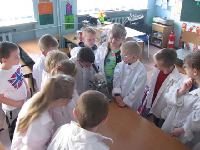 Zainteresowania dzieciaków z klasy 1b krążą wokół przyrody, ekologii i otaczającego nas świata. Dlatego wspaniałym pomysłem dla uczniów było bliskie spotkanie z mikroskopem. Wszyscy z zaciekawieniem obserwowali różne preparaty i nauczyli się operować mikroskopem. Nie mogło zabraknąć fachowego słownictwa – dzieci poznały budowę tego wspaniałego urządzenia, a na koniec ilustrowały to co widziały pod mikroskopem. Dodatkowym atutem zajęć były stroje, których nie powstydziliby się prawdziwi naukowcy!