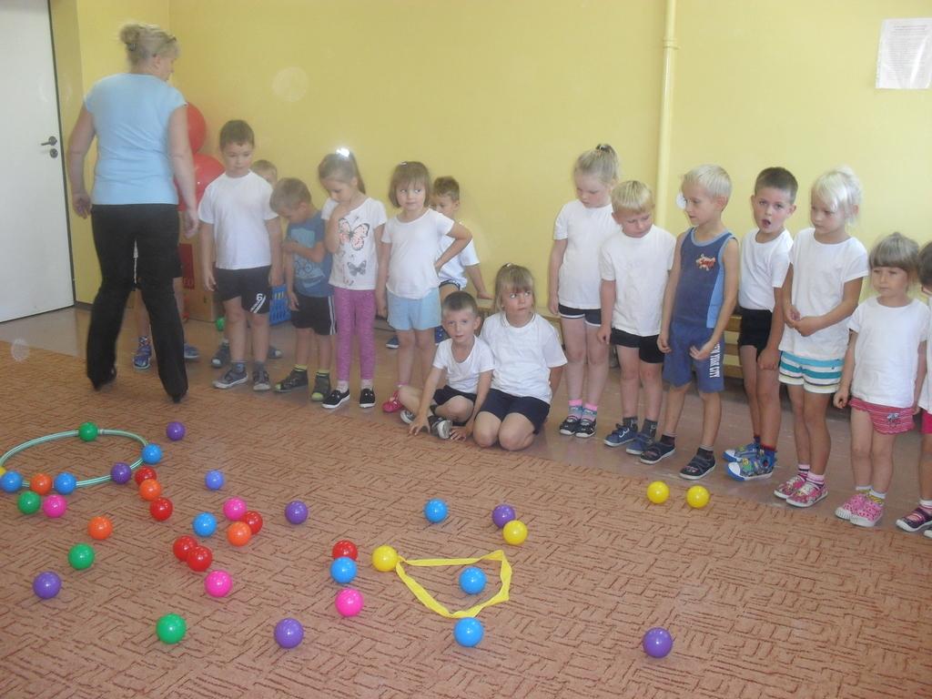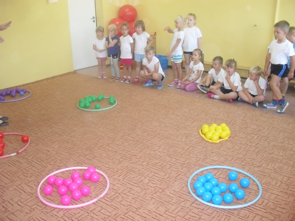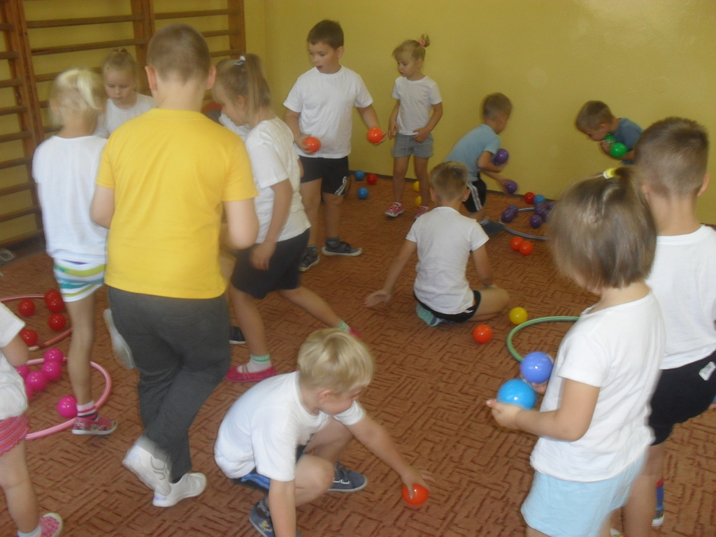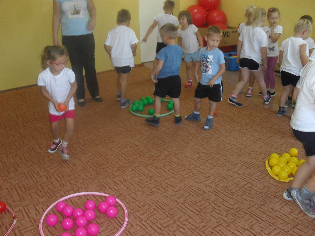Na zajęciach wychowania fizycznego bywa tak, że łączymy siły. Grupa 4 i 5-latków z klasą 1 potrafi pięknie bawić się i uczyć, korzystając z wszystkich dostępnych środków, nawet kolorowych piłeczek do suchych basenów. Najczęściej wykorzystywane są jako wypełniacze do pustych basenów, jednak my mamy na nie inne pomysły. Dzieci młodsze uczą się i utrwalają kolory, klasa 1 jest na bieżąco z kształtowaniem pojęć „mniej”, „więcej”, „tyle samo”, jak również porządkowaniem według cechy. Na ostatnich zajęciach zadaniem dzieci było znaleźć „domki”-kolorowe hula-hop, dla piłek w odpowiednim kolorze i przelicznie liczebności zbiorów.