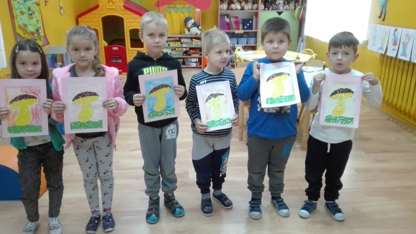 Wycieczką do pobliskiego lasu rozpoczęliśmy poszukiwania jesiennych darów. Na leśnej polanie - wrzosowisko, susza i cisza, tylko grzybów brak, ale my mamy album o grzybach. Nasza pani pokazuje i uczy, które są jadalne, a które trujące. Niektóre znamy, bo często z rodzicami chodzimy na grzyby. Zainspirowani wycieczką dostaliśmy dwa zadania do wykonania. Z wycinanki odtworzyć borowika szlachetnego, a farbą namalować muchomora czerwonego.
