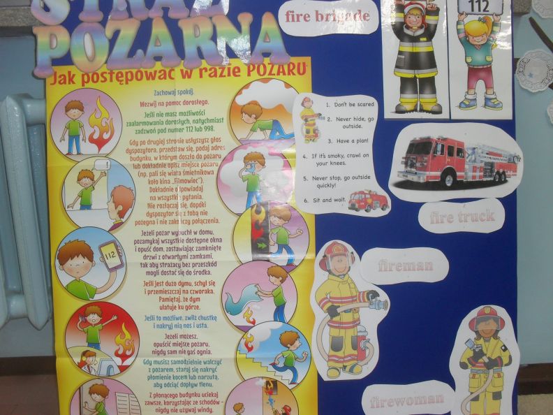 Wychowawcy klas „0” – III przeprowadzili wśród uczniów pogadanki na temat zatruć czadem, jak również o zachowaniu się podczas wybuchu pożaru. Zostały również przypomniane numery alarmowe. Wszyscy uczniowie mieli możliwość obejrzeć kilka filmów o zagrożeniach dla życia i zdrowia ludzi, które spowodowane są ogniem.