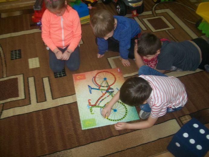 Ostatnimi czasy Przedszkolaki z Soczewki poczuły niezwykłą aurę, z powodu zbliżającej się wiosny. Biorąc pod uwagę ten fakt, postanowiły spróbować swoich sił przemierzając przez dydaktyczno - rowerową mapę. Przybrała ona formę gry planszowej. Dzieciaczki posługując się ogromną kostką pluszową oraz kolorowymi pionkami, przemieszczały się po mapie wzdłuż i wszerz. Rozwiązywały przy tym łamigłówki sylabowe, nazywały części roweru, a także wykonywały ćwiczenia ruchowe.