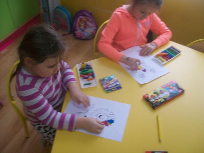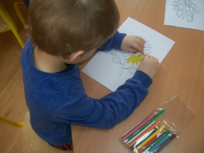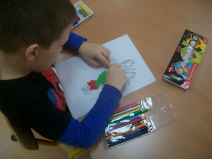 W trakcie kolejnego etapu zajęć, uczestniczki i uczestnicy ozdabiali przy użyciu plasteliny szablony kwiatów. W ten sposób utrwalali podział nazw roślin na głoski i litery. Pojawiły się żonkile, tulipany i uśmiechnięte słoneczniki. Prace uczniów zostały wyeksponowane na wystawie klasowej. Następnie wszyscy otrzymali kolorowe, filcowe serduszka. Radość i serdeczność unosiły się w powietrzu.