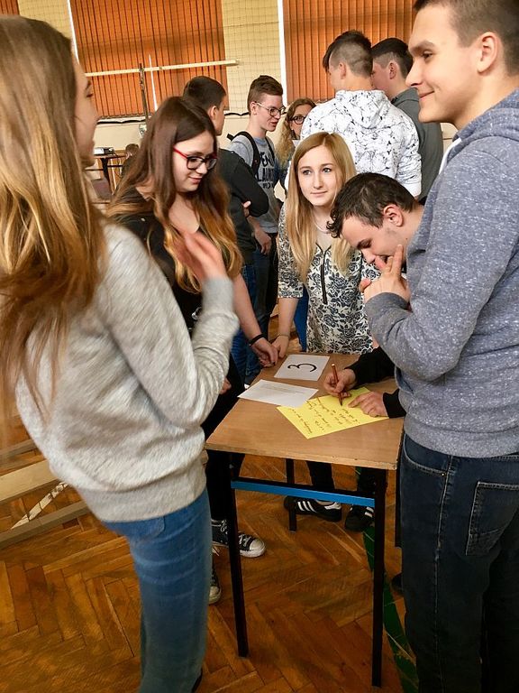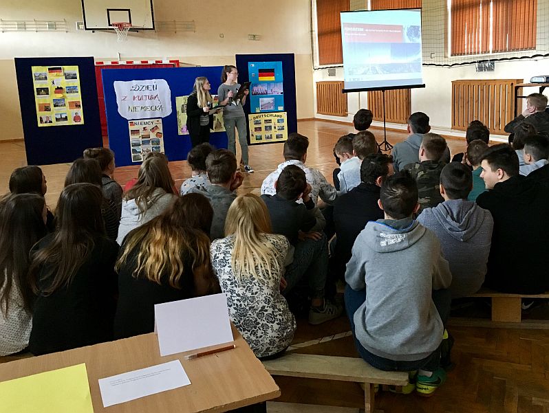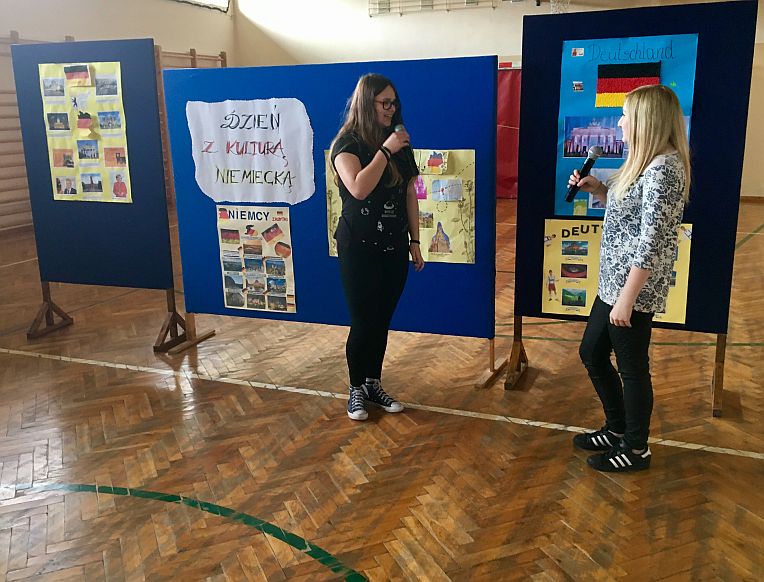 Pod takim hasłem odbyły się warsztaty z językiem niemieckim. 24 kwietnia 2017r. w sali gimnastycznej zgromadzili się uczestnicy wycieczki do Niemiec, łącznie 40 osób. Celem zorganizowanych zajęć było pogłębienie wiedzy na temat kraju naszych sąsiadów, doskonalenie umiejętności współpracy w grupie, a przede wszystkim wykorzystanie zdobytej wiedzy w praktyce. Podczas spotkania uczniowie pracowali metodą stanowisk tzw. stacji dydaktycznych. Nauczyciel języka niemieckiego dokonał podziału na grupy pięcioosobowe. Każdy zespół otrzymał inne zadanie np.: zbudowanie dialogu w którym pytamy o godzinę, o drogę, o najważniejsze zabytki Berlina. Nauczyciel muzyki opracował quiz oparty na kompozycjach wybitnych twórców niemieckich. Całość dopełniła prezentacja w programie Power Point „Kultura Niemiec”. Kasia Myzia i Aleksandra Kowalska to autorki wyżej wymienionej pracy.