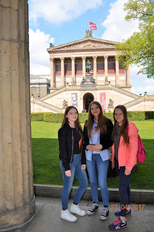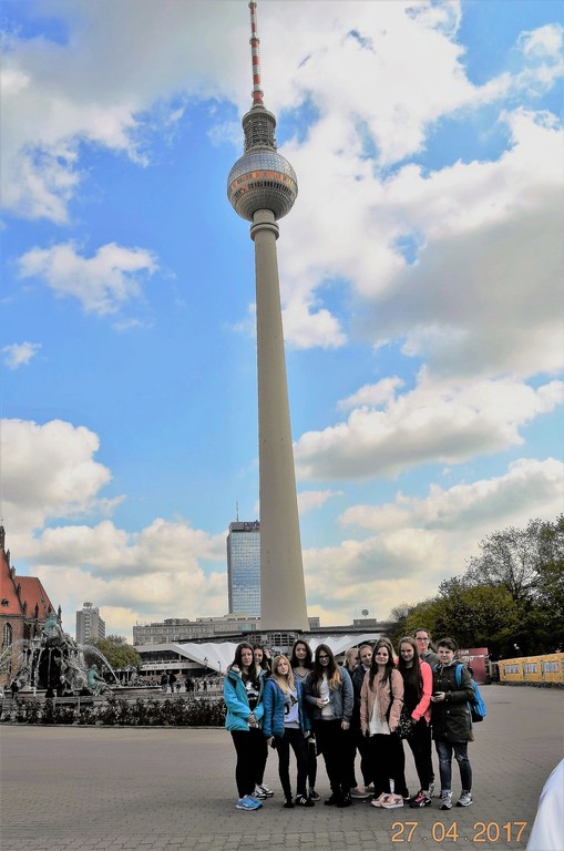 Drugiego dnia naszej wycieczki (27. 04. 2017r.)wyruszyliśmy do Berlina, stolicy Niemiec. Miasto pełne jest zabytków dokumentujących jego ciekawą i nierzadko trudną historię. Tuż po wjeździe do Berlina mogliśmy zobaczyć fragmenty Muru Berlińskiego (Berliner Mauer), który od 13 sierpnia 1961 do 9 listopada 1989 oddzielał Berlin Zachodni od Berlina Wschodniego. Następnie udaliśmy się na Plac Aleksandra (Alexanderplatz), na którym mogliśmy zobaczyć Wieżę Telewizyjną (Fernsehturm) oraz Fontannę Neptuna (Neptunbrunnen), na której usytuowany Neptun wieńczący centralną część fontanny otoczony jest personifikacjami czterech rzek: Łaby, Odry, Renu oraz Wisły. Spacerując po Berlinie przy słonecznej pogodzie zachwyciliśmy się ewangelicką Katedrą Berlińską (Berliner Dom), która wybudowana została w stylu późnego, włoskiego renesansu. Następnie zwiedziliśmy znajdującą się w pobliżu Wyspę Muzeów (Museuminsel), gdzie znajduje się jeden z najważniejszych kompleksów muzealnych świata, obejmujący: Muzeum im. Bodego (Bodemuseum), Muzeum Pergamońskie (Pergamonmuseum), Nowe Muzeum (Neues Museum), Starą Galerię Narodową (Alte Nationalgalerie) oraz Stare Muzeum (Altes Museum). Spacerując Aleją pod Lipami (Unter den Linden), która uważana jest za najpiękniepszą aleję miasta, mogliśmy zobaczyć Uniwersytet Humboldtów (Humboldt -Universitӓt). Po zwiedzeniu wschodniej części Berlina udaliśmy się autokarem do dzielnicy Tiergarten, aby zwiedzić gmach Parlamentu Rzeszy (Reichstag) ze szklaną kopułą. W sąsiedztwie Reichstagu znajduje się Brama Brandenburska (Brandenburger Tor), wizytówka Berlina, która stanowi symbol jedności i wolności miasta. Nasze zainteresowanie wzbudził również Pomnik Pomordowanych Żydów Europejskich (Holocaust -Mahnmal) – 2 711 betonowych bloków tworzących przedziwny labirynt. Ostatnim miejscem, które mogliśmy zwiedzić w Berlinie był Kościół Pamięci Cesarza Wilhelma, zwany też Kościołem Pamięci (Kaiser-Wilhelm-Gedӓchtniskirche), który jest symbolem II Wojny Światowej. Wieża kościoła została uszkodzona podczas bombardowania.