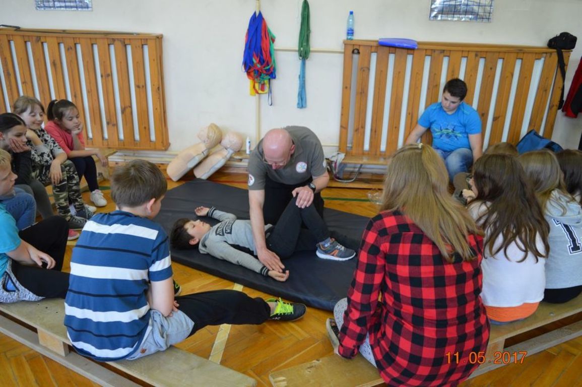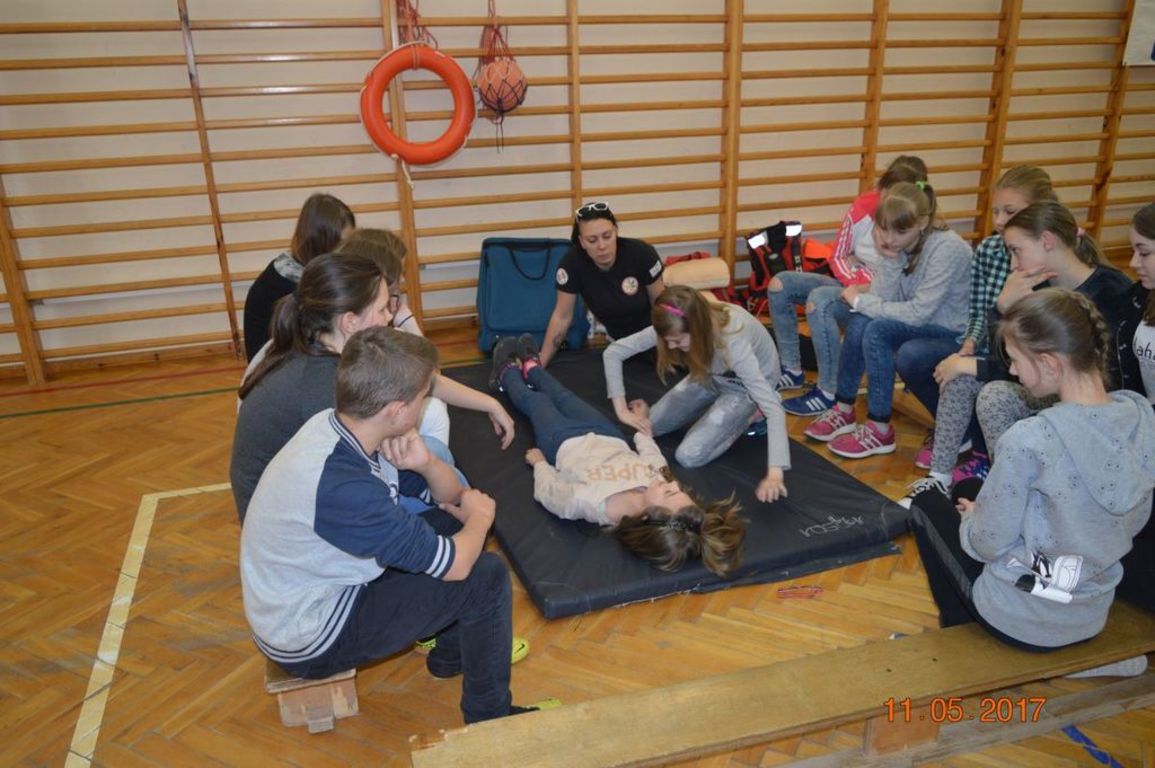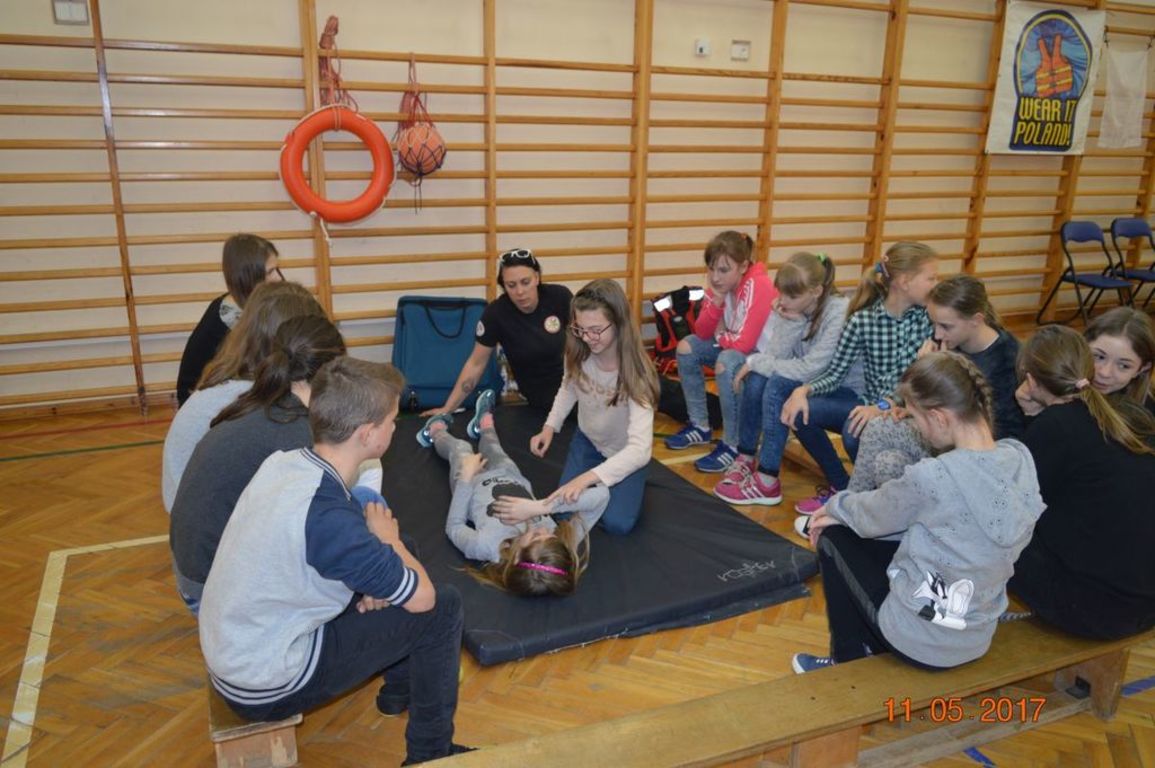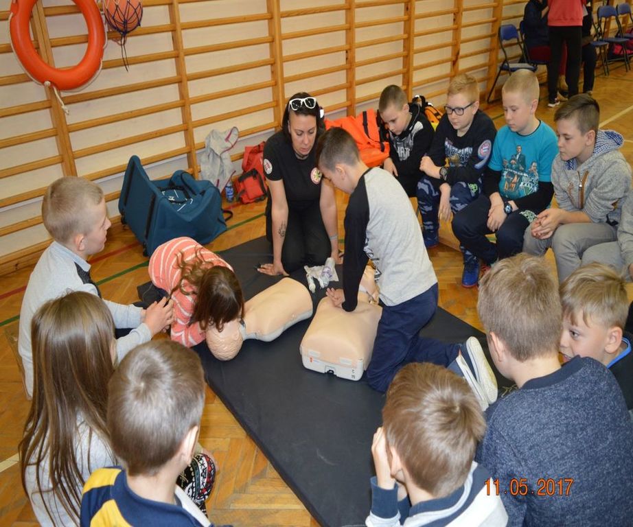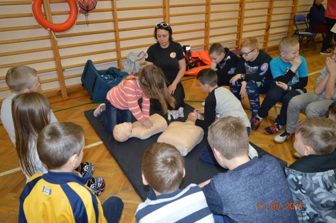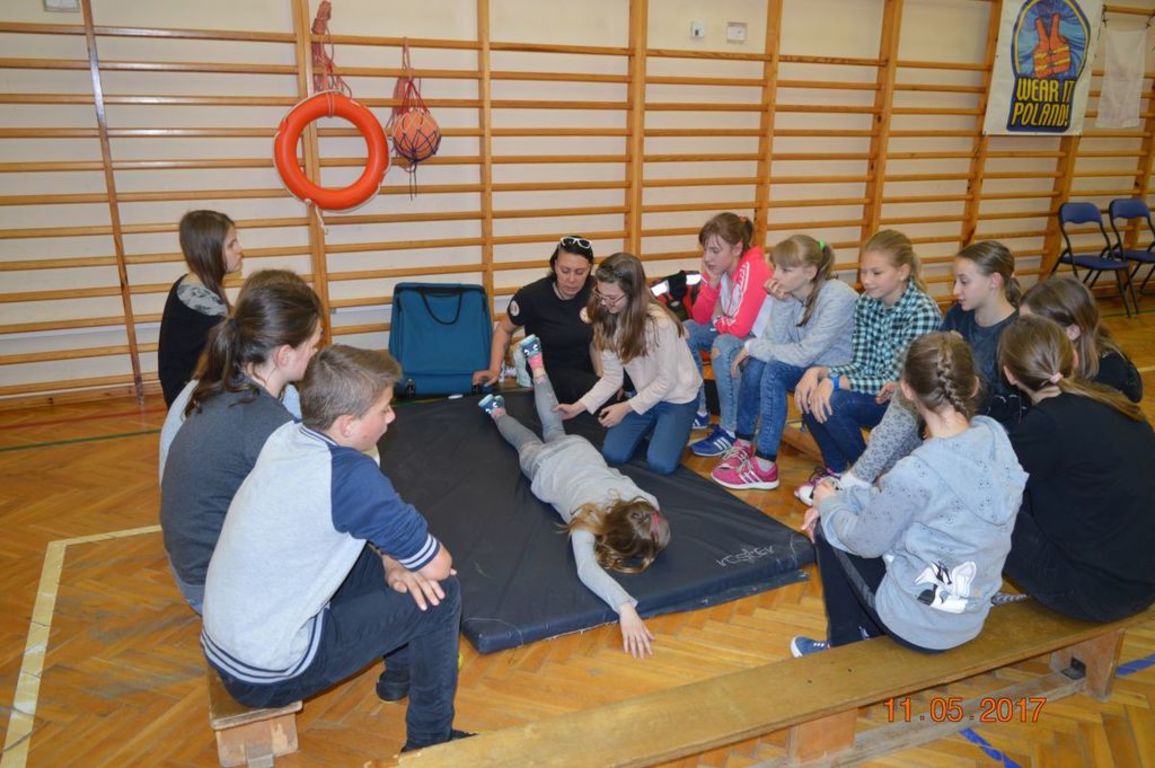 11. 05. 2017r. przedstawiciele Centrum Turystyki Wodnej PTTK, w ramach projektu pn. "Woda, dziecko, bezpieczeństwo, akcja informacyjno - edukacyjna" przeprowadzili w naszej szkole dla uczniów klas III - VI szkolenie teoretyczno - praktyczne z zakresu nauki udzielania pierwszej pomocy przedmedycznej. W ramach spotkania odbyły się zajęcia teoretyczne i praktyczne, w trakcie których zawodowi instruktorzy i ratownicy medyczni uczyli dzieci i młodzież właściwego zachowania się w przypadku zagrożenia nad wodą i w wodzie oraz przeprowadzili ćwiczenia z resuscytacji krążeniowo - oddechowej z wykorzystaniem manekinów. Każde dziecko uczestniczące w zajęciach miało okazję na samodzielne wykonywanie ćwiczeń z zakresu udzielania pierwszej pomocy. Uczniowie otrzymali również materiały szkoleniowe i certyfikaty ukończenia szkolenia.