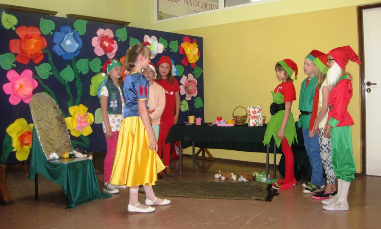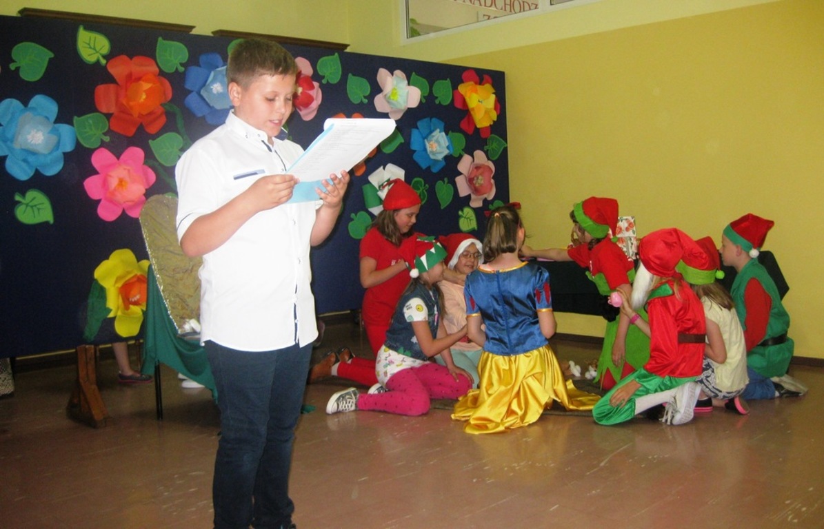 W dniu 30. 05. 2017r. odbyło się przedstawienie zorganizowane przez uczniów klasy IIIB pt. „Królewna Śnieżka i siedmiu krasnoludków”. Spektakl został zaprezentowany młodszym kolegom i koleżankom. Przygotowania rozpoczęły się już w marcu. Dzieci wspólnie zastanawiały się nad wyborem bajki, analizowały różne scenariusze. Po długich dyskusjach zdecydowano, że przygotujemy inscenizację bajki pt. „Królewna Śnieżka i siedmiu krasnoludków”. Zorganizowaliśmy mały casting, podczas którego wspólnie obsadzaliśmy role.