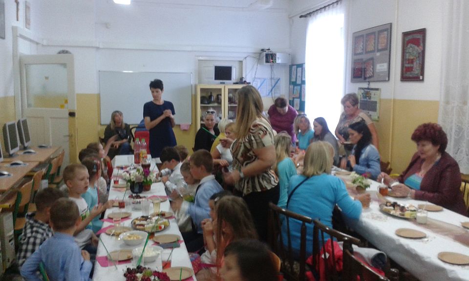Następnie po wspólnym odśpiewaniu „100 lat” dla wszystkich i rozdaniu przez dzieci rodzicom samodzielnie wykonanych upominków udaliśmy się na część III imprezy, czyli wspólny rodzinny poczęstunek. Dzień Rodziny to kolejna udana impreza zorganizowana w Szkole Filialnej w Soczewce.