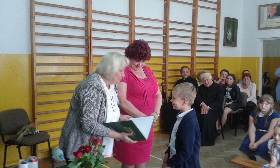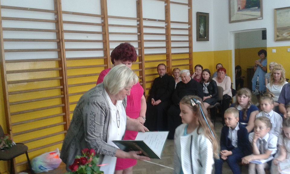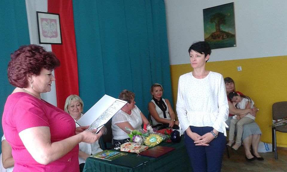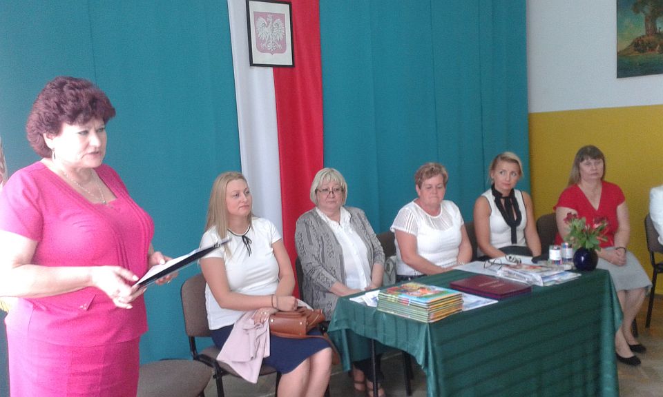 Na sali gimnastycznej przywitała wszystkich p. dyrektor Ewa Romańska wraz z nauczycielami. Pani Dyrektor podziękowała rodzicom za współpracę, dzieciom za starania w zdobywaniu wiedzy a nauczycielom za trud włożony w te starania. Podziękowania też otrzymali pracownicy szkoły, którzy zawsze oferowali swą pomoc. Następnie pani Dyrektor życzyła uczniom i ich rodzicom bezpiecznych i udanych wakacji.