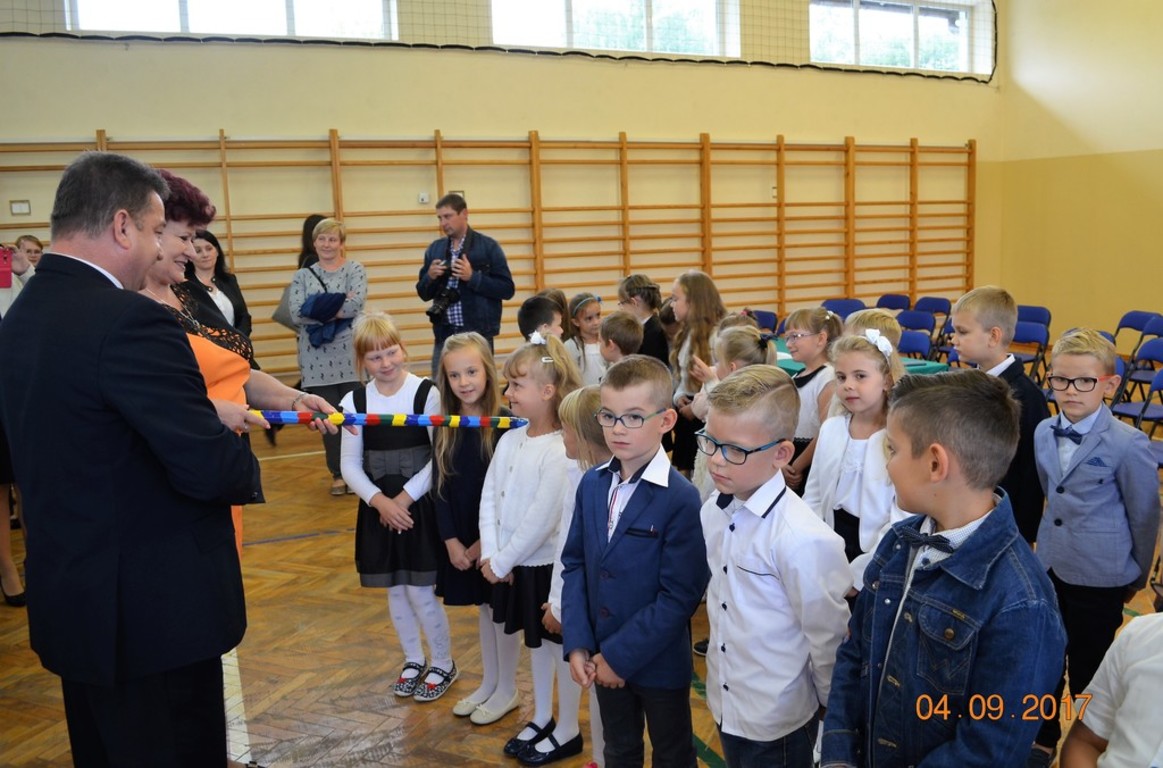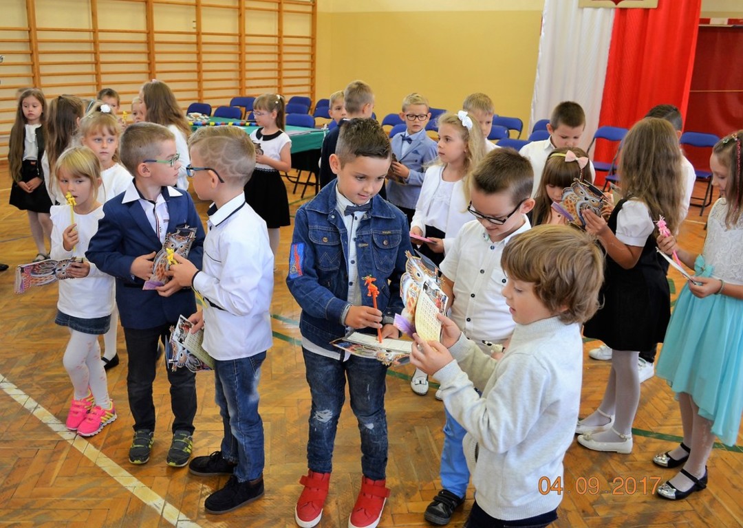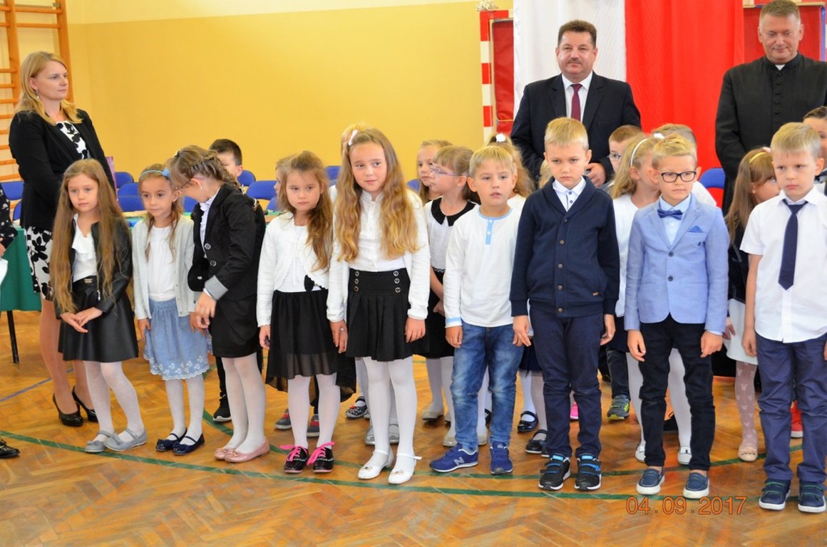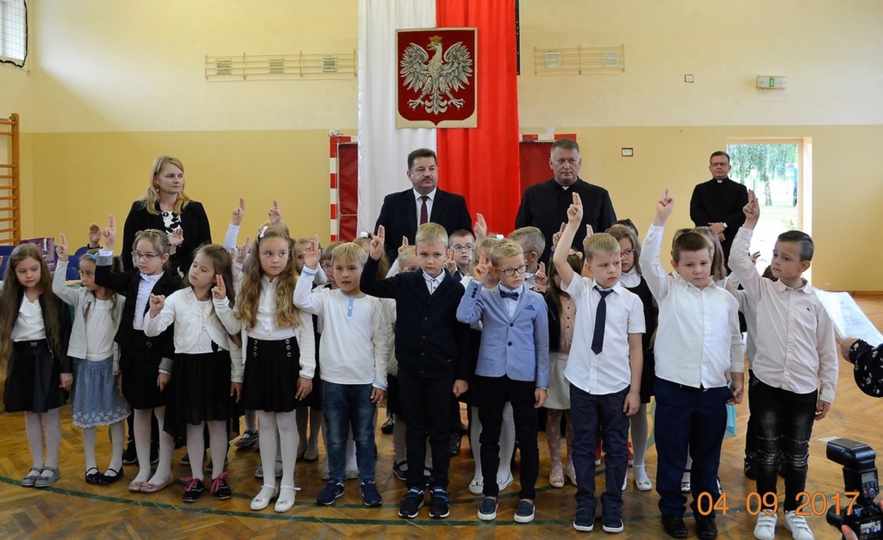 4 września rozpoczął się rok szkolny 2017/2018. Tego dnia 29 dzieci złożyło uroczyste ślubowanie i zostało pasowanych na uczniów klasy I. Uczniowie złożyli przyrzeczenie „(…) być dobrym Polakiem, dbać o dobre imię swojej klasy i szkoły(…)”. W tym szczególnym dniu towarzyszył nam pan wójt Mirosław Krysiak, który wręczał drobne upominki i znaczące dla dzieci dyplomy pasowania na ucznia.