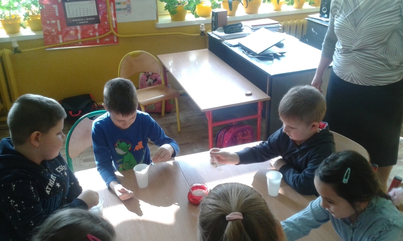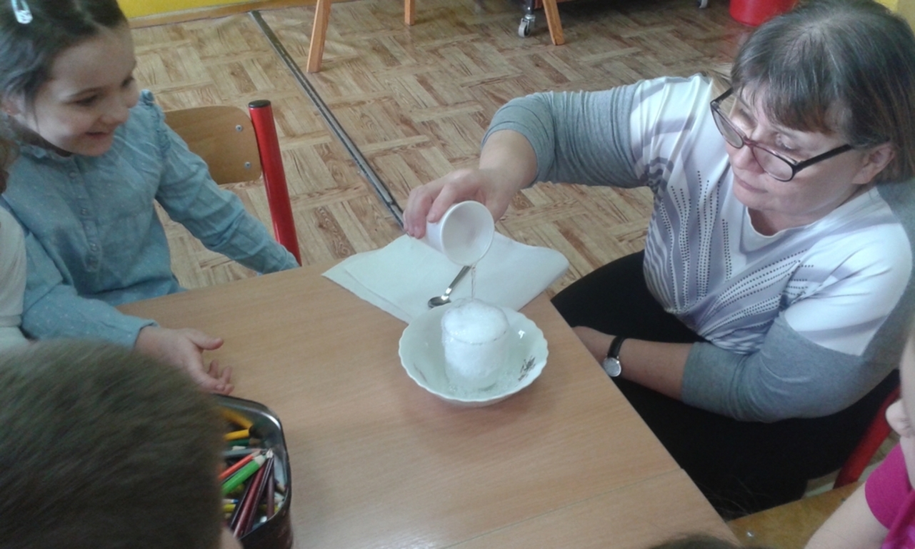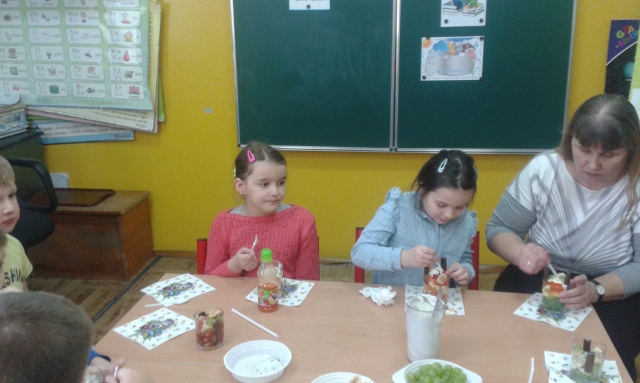 Uczniowie klasy 1 wspólnie udali się do „zerówki”, by zaprosić przyszłych pierwszaków na przygotowane zajęcia i zabawy. Spotkanie rozpoczęło się od zaprezentowania umiejętności wokalnych przez uczniów klasy 1. W czasie zajęć dzieci przeprowadzały doświadczenia „wulkan” i założyły hodowle kryształów. Wszystkie zadania powiązane były z przysłowiem „W marcu jak w garncu”. Uczniowie „łowili makaronowe rybki” spinaczami, poruszali piłeczkę po wyznaczonym torze za pomocą słomki i bawili się w czasie zabaw ruchowych. Zajęcia zakończono wspólnym przygotowaniem deseru. Dzięki pomocy rodzicom z kl. 1 uczniowie mieli przygotowane galaretki, które kroili. Wychowawca przygotował bitą śmietanę z kremówki i teraz pozostało już tylko samodzielnie przygotować deser według własnego pomysłu. Zajęcia zakończono wręczeniem wszystkim uczestnikom Dyplomu Małego Naukowca oraz pamiątek przygotowanych przez wychowawcę klasy 1. Bardzo dziękuję rodzicom za pomoc w przygotowaniu zajęć na „dzień otwarty w klasie 1”.