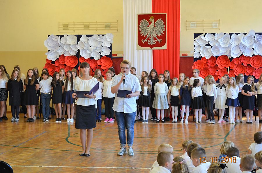 W krótkim wystąpieniu uczniowie klasy VA i VIIIB przybliżyli zgromadzonym postać Patrona Szkoły.