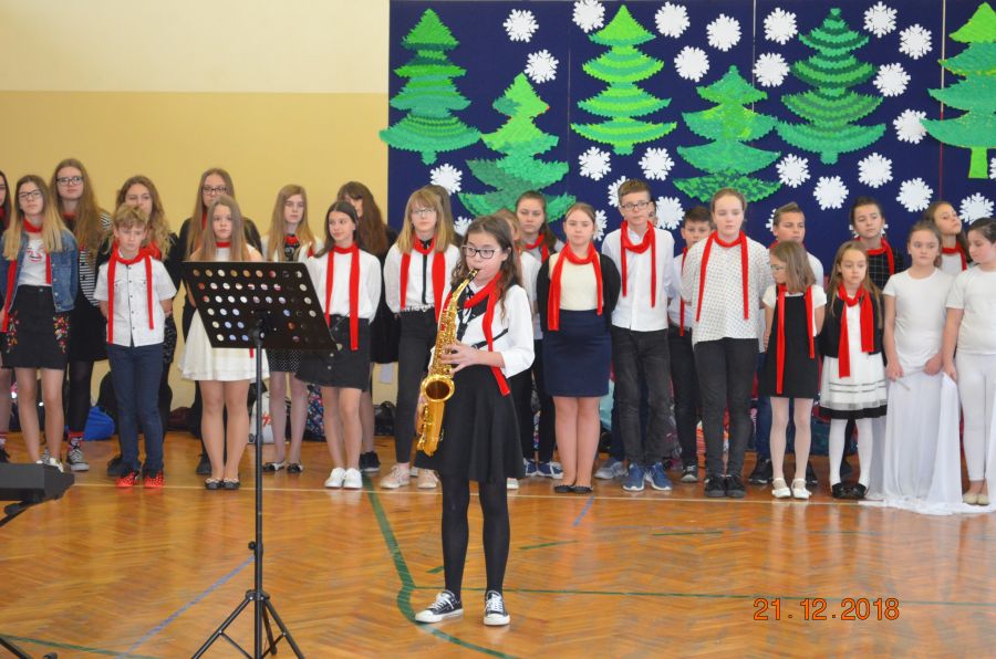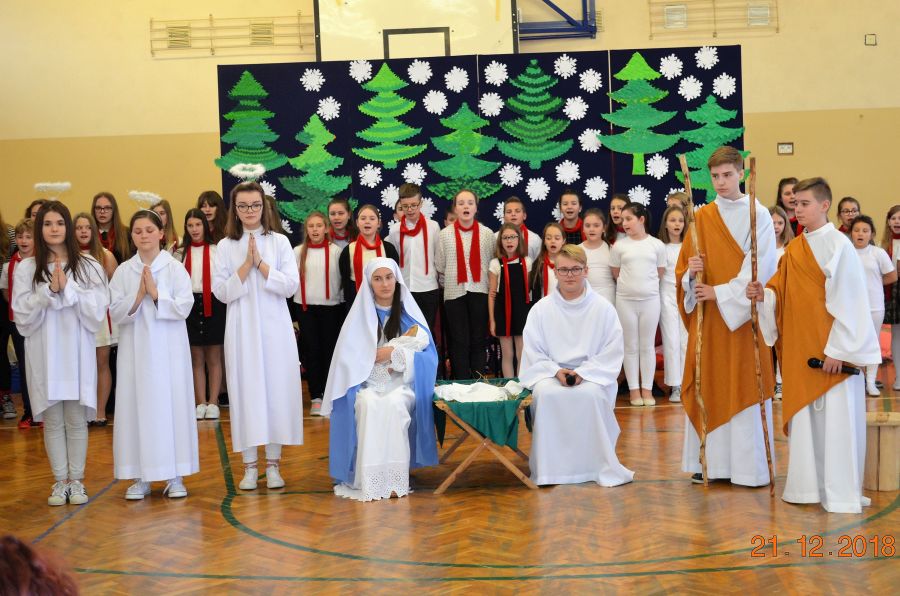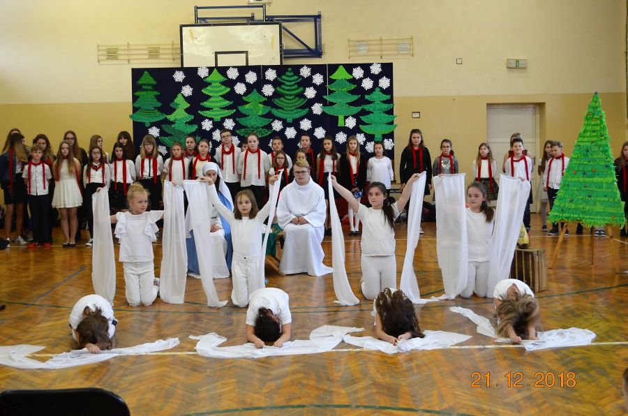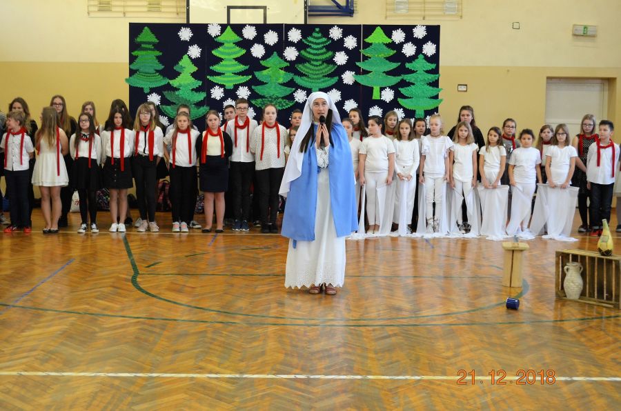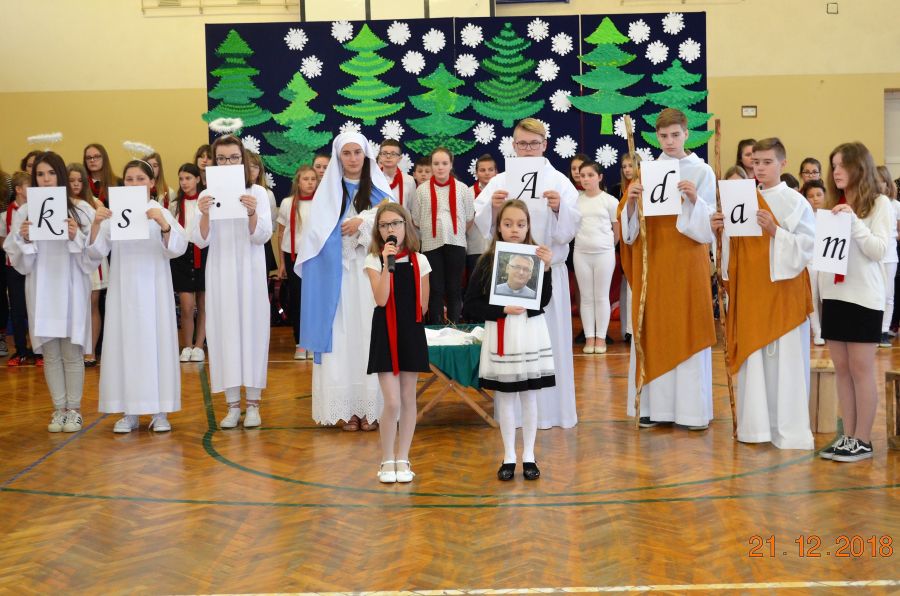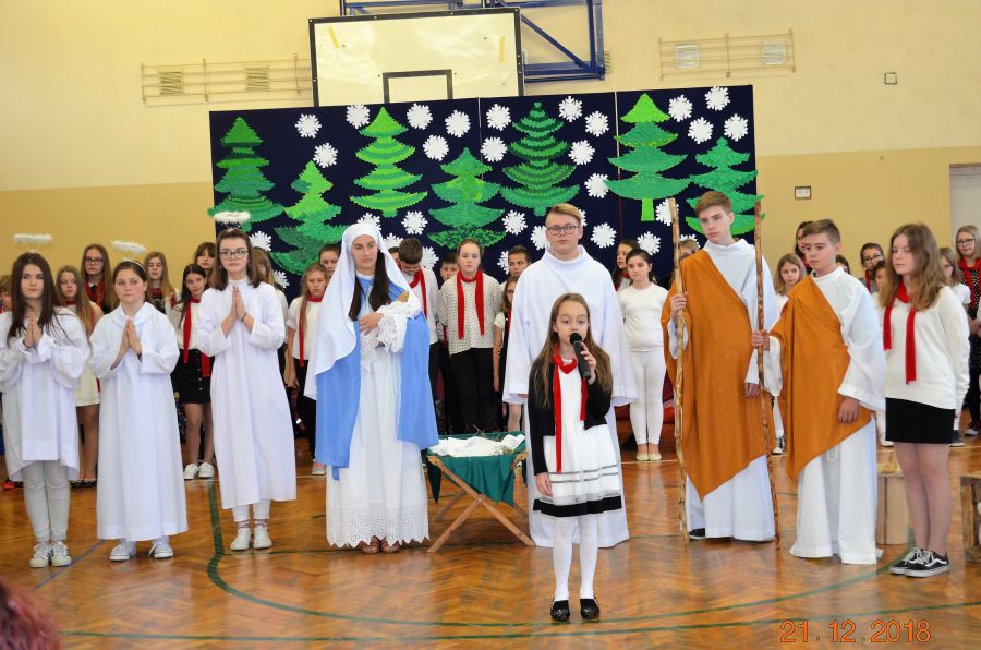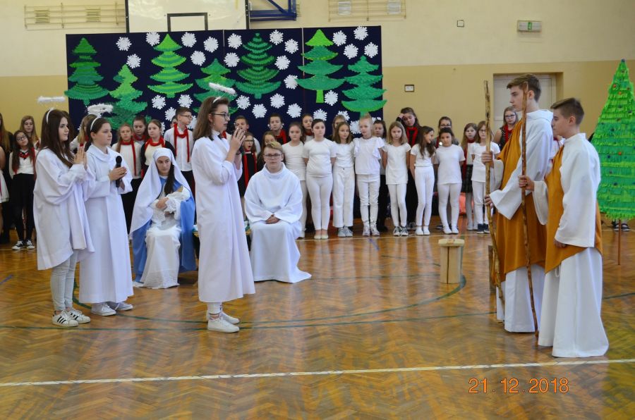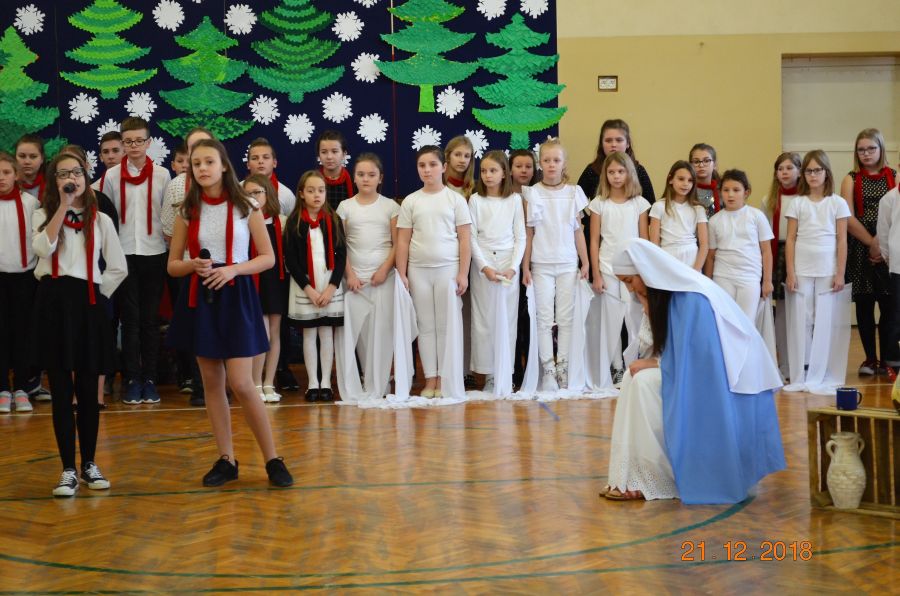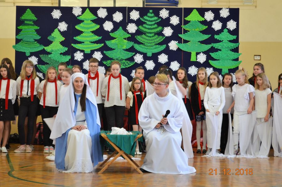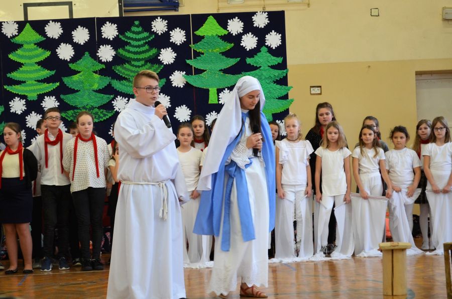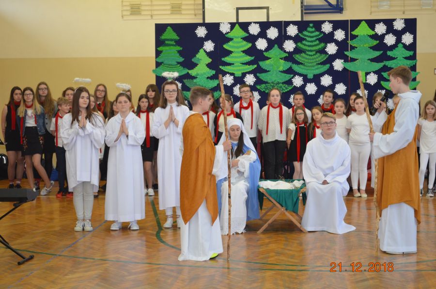Tego dnia społeczność szkolna zgromadziła się w pięknie udekorowanej sali gimnastycznej. Po raz kolejny przeżywaliśmy historię Marii i Józefa szukający miejsca do schronienia. Inscenizacja ukazująca narodzenie dzieciątka przeplatana była kolędami i pastorałkami. Ogromne zaangażowanie młodych aktorów sprawiło, że przedstawienie nagrodzono gromkimi brawami.