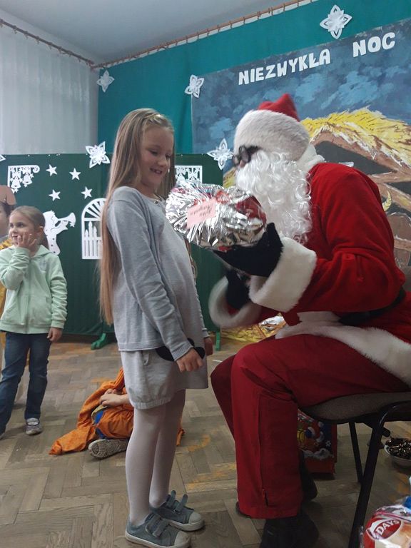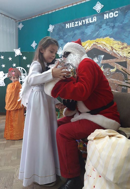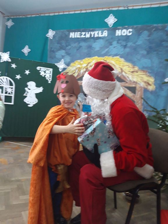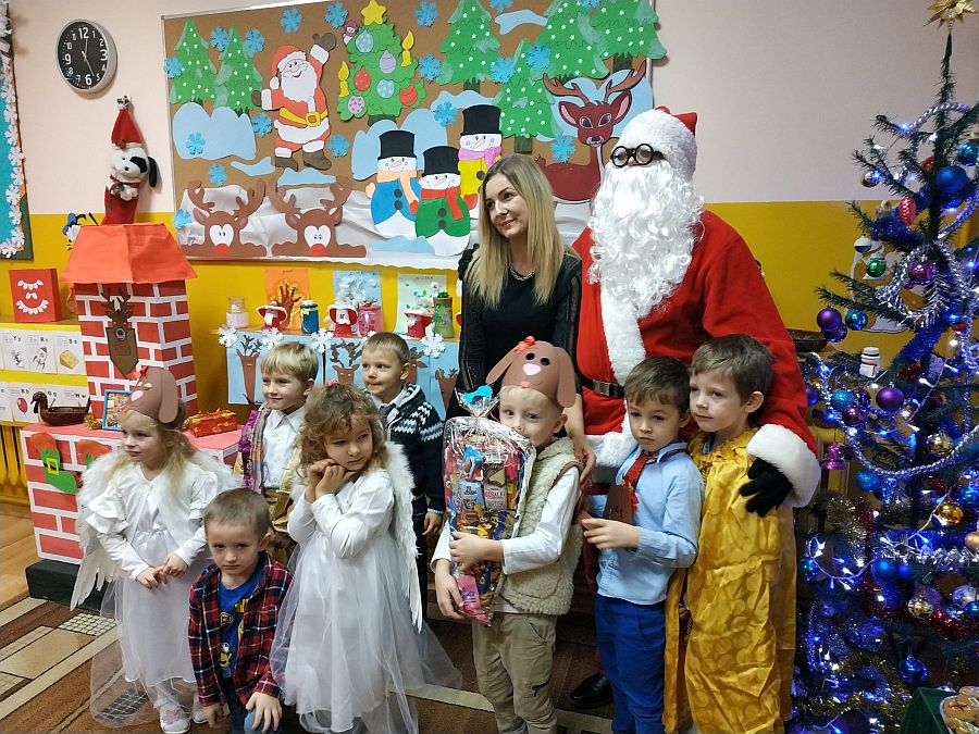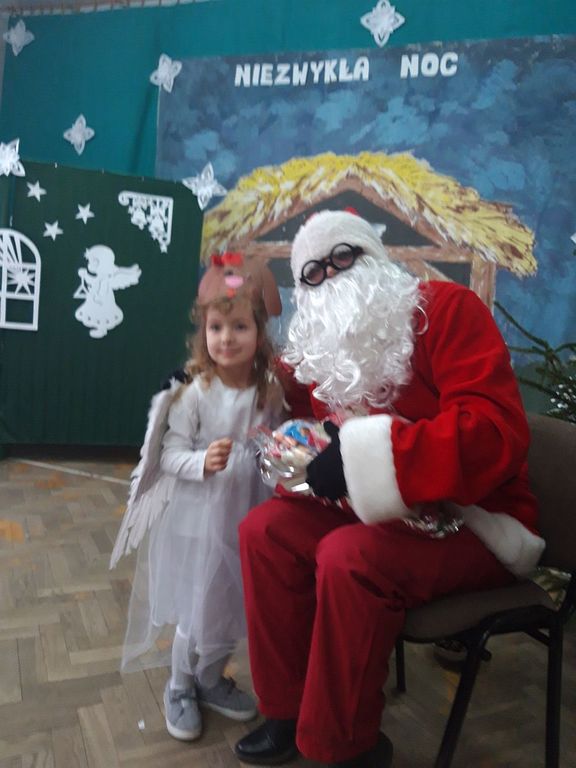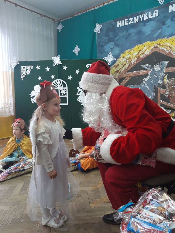 Święty Mikołaj lubi odwiedzać dzieci w każdym miejscu na całym świecie. 20 grudnia 2018 r. z workiem pełnym prezentów przybył również do naszej szkoły. Dzieci były bardzo szczęśliwe, rozpromienione, a kiedy znalazły się blisko św. Mikołaja – troszkę zawstydzone. Oprócz worka pełnego prezentów św. Mikołaj przywiózł ze sobą dużo uśmiechu. Rozmawiał z dziećmi, zachęcał, aby grzeczne i słuchały rodziców i pań w szkole. Na zakończenie wręczał prezenty dzieciom, a w nich dla każdego coś dobrego. Za prezenty przedszkolaki odwdzięczyły się pięknie zaśpiewaną piosenką. Oczekiwana cały rok wizyta św. Mikołaja minęła w bardzo miłej atmosferze i przyniosła dzieciom wiele radości.