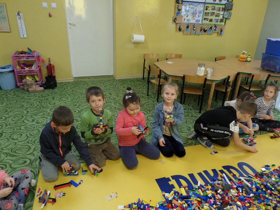 15 stycznia sale przedszkolne zmieniły się w krainę klocków lego. Odwiedziły nas panie, które poprowadziły warsztaty z logicznego i kreatywnego myślenia w budowaniu z klocków lego. Tematem przewodnim był wiatr. Maluchy oceniały siłę wiatru wytworzoną przez wiatrak, obserwowały zachowanie wstążek i baloników na wietrze oraz poznawały urządzenia, do których funkcjonowania niezbędny jest wiatr. Na zakończenie warsztatów dzieci wykazywały się własną inwencją twórczą, konstruując żaglowiec. Żaglowce prawidłowo skonstruowane musiały pokonać określony dystans, popychane siłą wiatru. Wszystkie budowle przeszły test, chociaż wcale nie było łatwo. Były to bardzo ciekawe i inspirujące zajęcia.