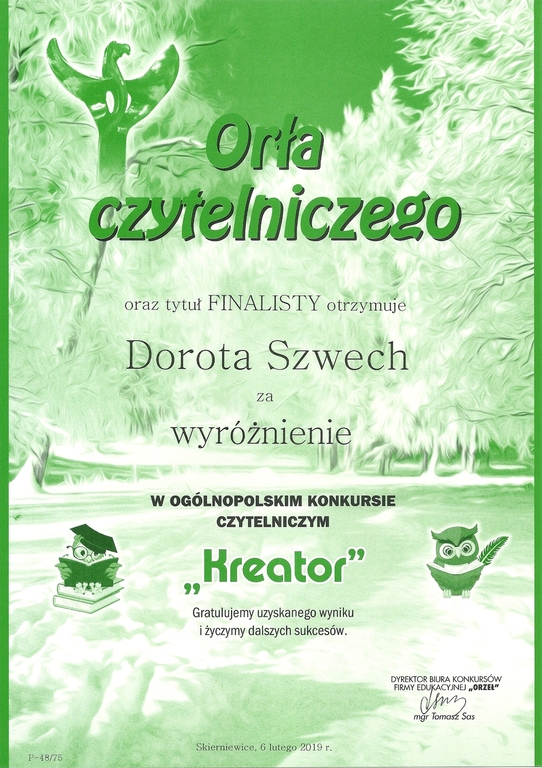 WYRÓŻNIENIE W OGÓLNOPOLSKIM KONKURSIE CZYTELNICZYM „KREATOR”