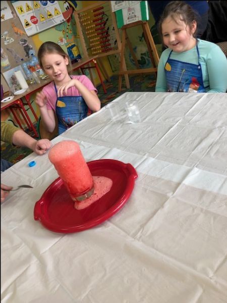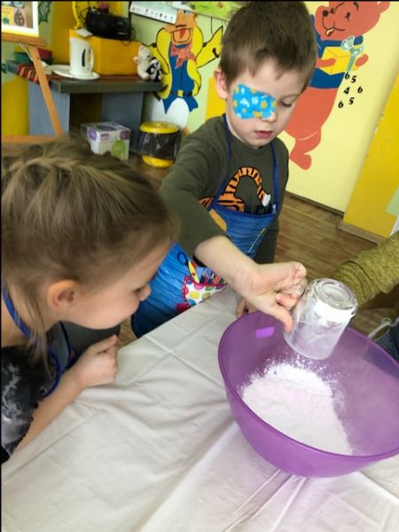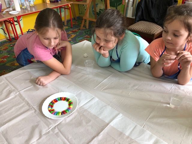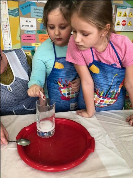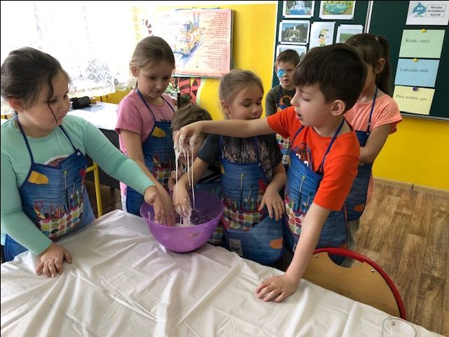 Zajęcia rozpoczęliśmy od rozwiązywania zagadek, rebusów i poznawania właściwości wody, w tym trzech stanów skupienia wody. Rozmawialiśmy też o sposobach oszczędzania wody. Następnie przystąpiliśmy do wykonywania różnych eksperymentów, oczywiście z wodą w roli głównej. Największym powodzeniem cieszyły się doświadczenia: „Ciecz nieniutonowska”, „Magiczna woda”, „Wulkan”, „Kolorowa tęcza”, „Burza w szklance”.