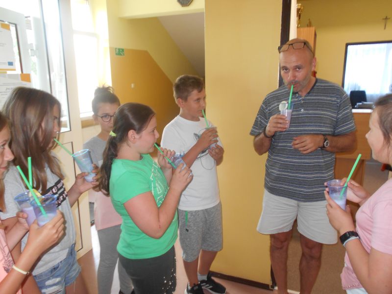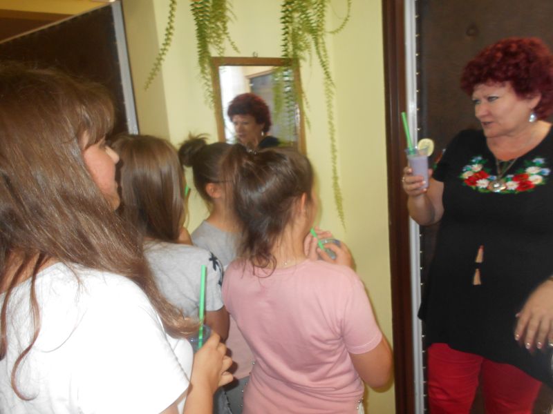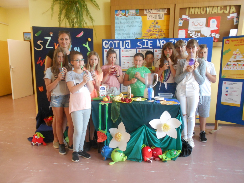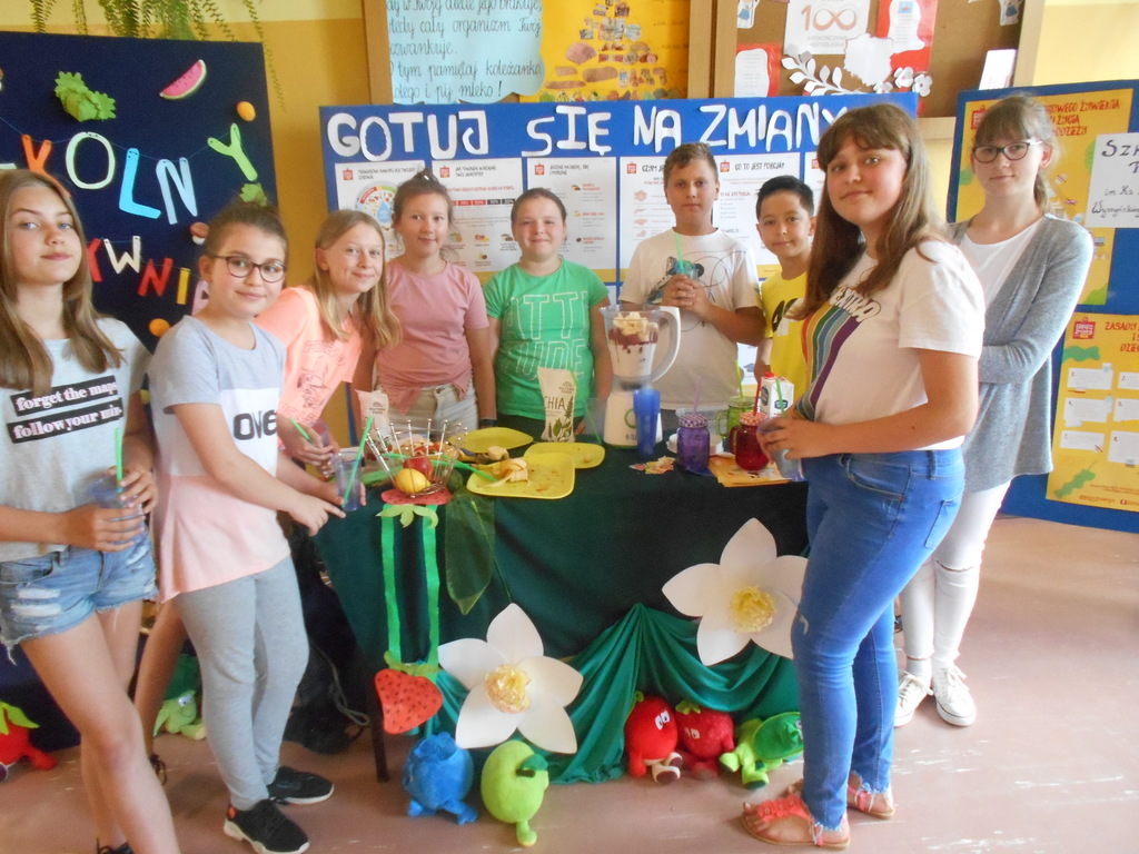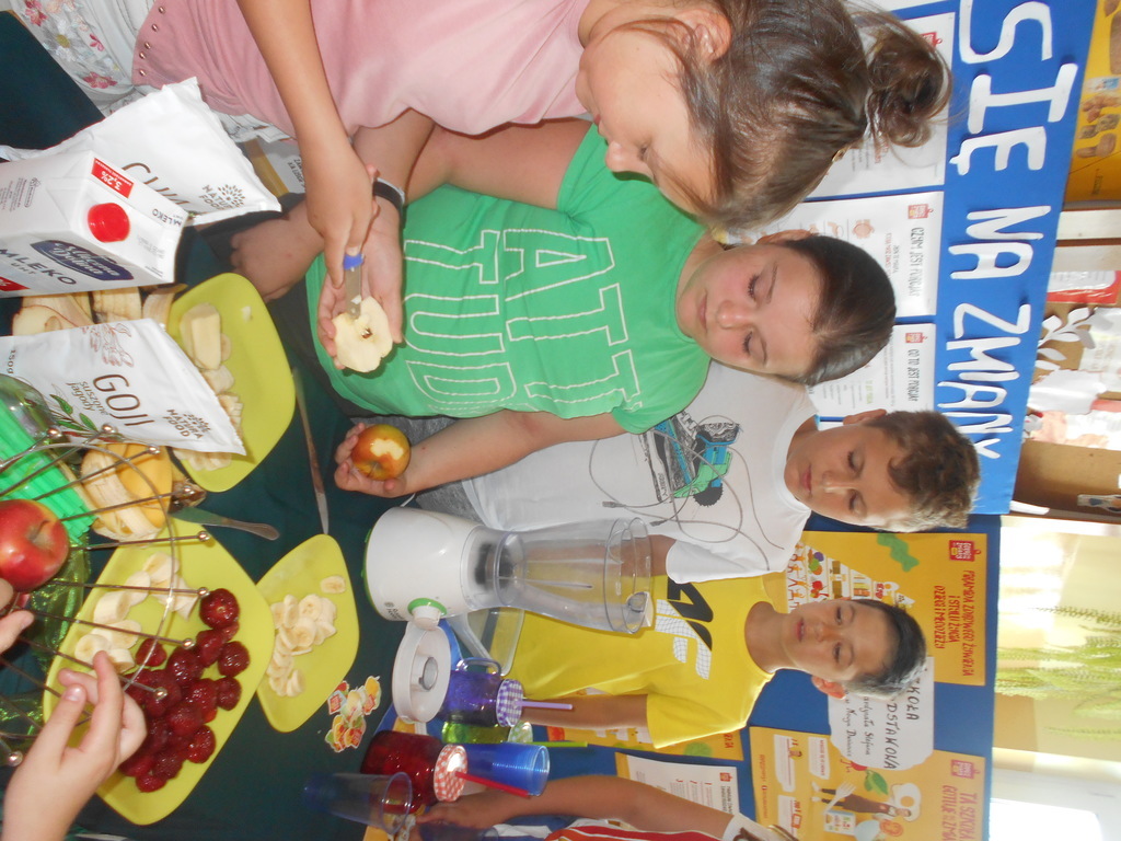 d) Akcja “Color food is so healthy and good”- robimy pyszne, zdrowe koktajle i smoothie. W ramach akcji przygotowano świeże, kolorowe bomby witaminowe, jakimi są koktajle i smothie. Uczniowie skosztowali swoich wyrobów w myśl zasady “Color food is so healthy and good” oraz poczęstowali nimi Panią Dyrektor oraz Pana Dyrektora.