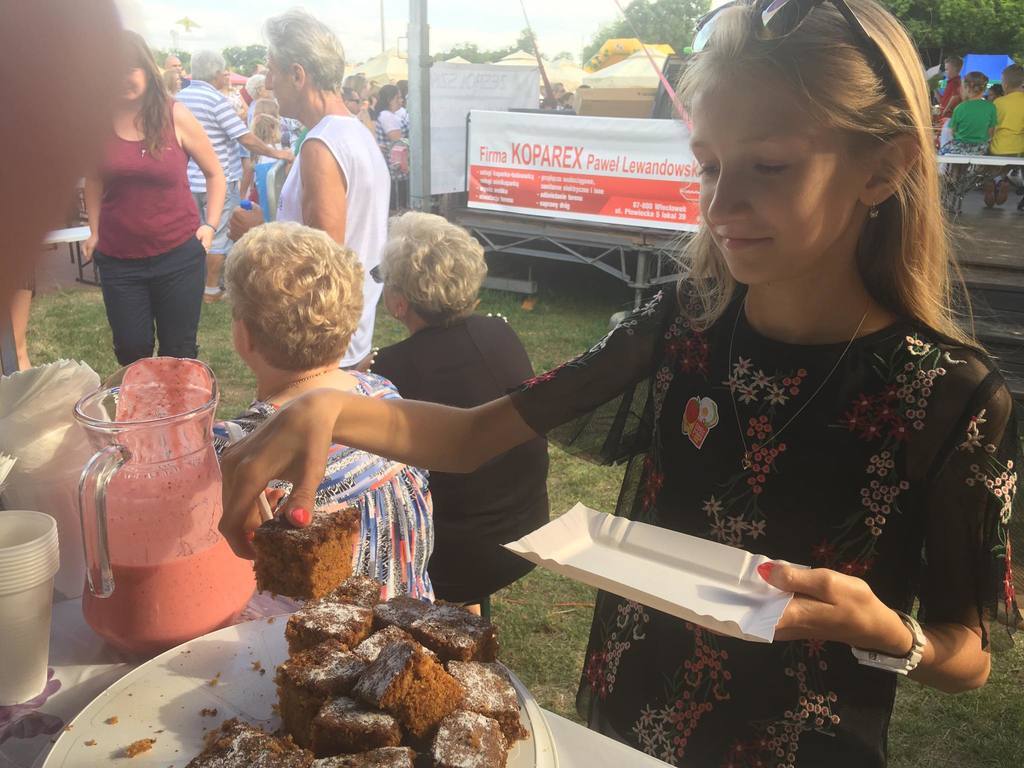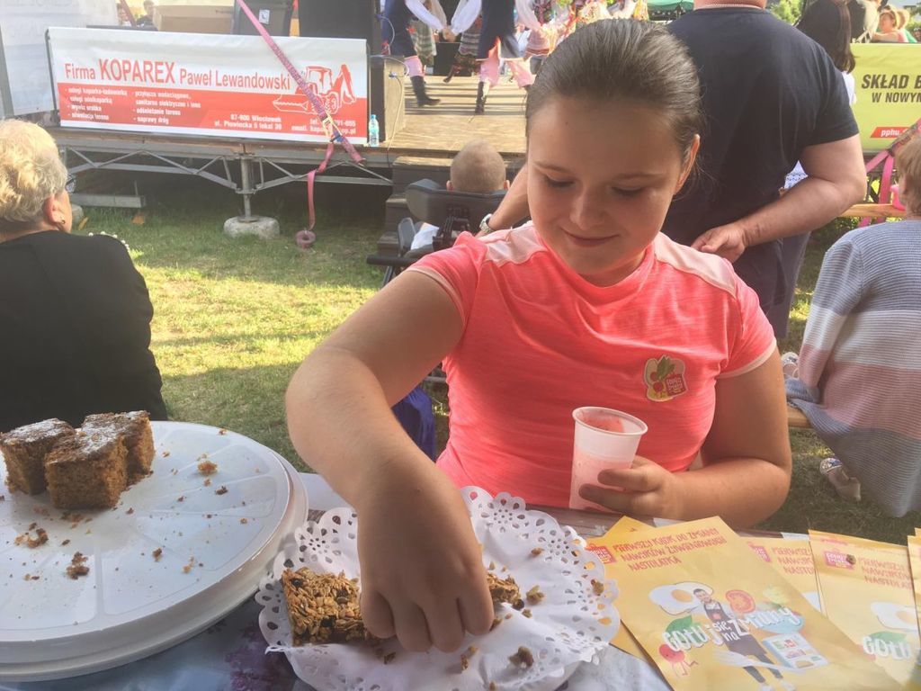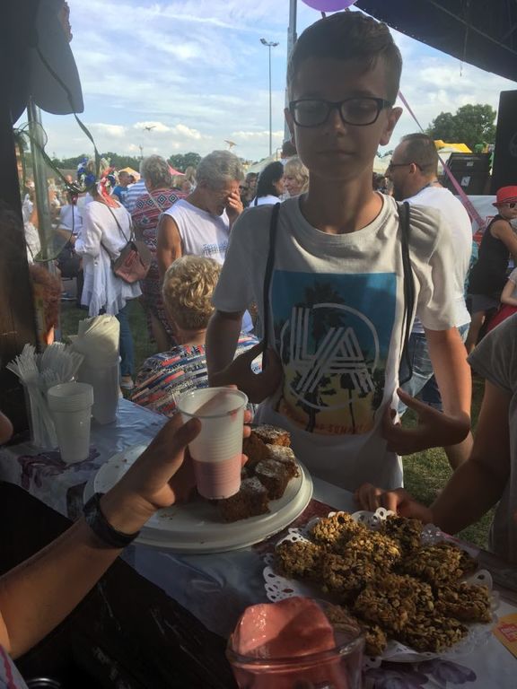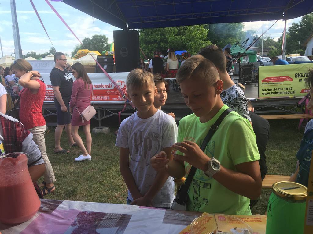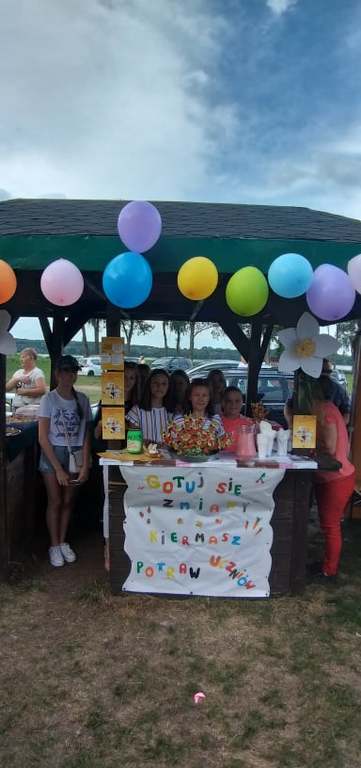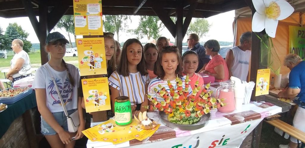 b) “Kiermasz potraw ugotowanych przez uczniów” - uczniowie klasy VB również podczas “Biesiady Świętojańśkiej” na stoisku przez nich przygotowanym częstowali przybyłych gości potrawami przez nich przygotowanymi. Dla smakoszy zdrowych produktów uczniowie przygotowali m.in.: pyszne, zdrowe kanapki, kolorowe, owocowe saszłyki, ciasto marchewkowe, muffiny jogurtowe, sałatka owocowa, koktajl truskawkowo-jogurtowy oraz ciasteczka owsiane. Kiermasz zdrowych produktów miał na celu sprowokowanie mieszkańców Gminy Nowy Duinów do refleksji na temat zdrowego żywienia oraz rozpowszechnienie nowych, smacznych dań zastępujących niezdrową żywność. Podczas przygotowywania potraw i przekąsek uczniowie zdobyli nowe umiejętności kulinarne i nauczyli się co mogą przyrządzić zamiast kupnych słodkich przekasek. W trakcie trwania kiermaszu uczniowie ustawili skarbonkę i wszyscy chętni smakosze mogli podziękować symbolicznie za degustację zdrowych przekąsek. Pozyskane przez uczniów środki finansowe zostaną przenaczone na zakup zdrowych produktów przeznaczonych na akcję “Jem zdrowe śniadanie w szkole”, którą uczniowie chcą zrealizować w szkole we wrześniu 2019 roku.