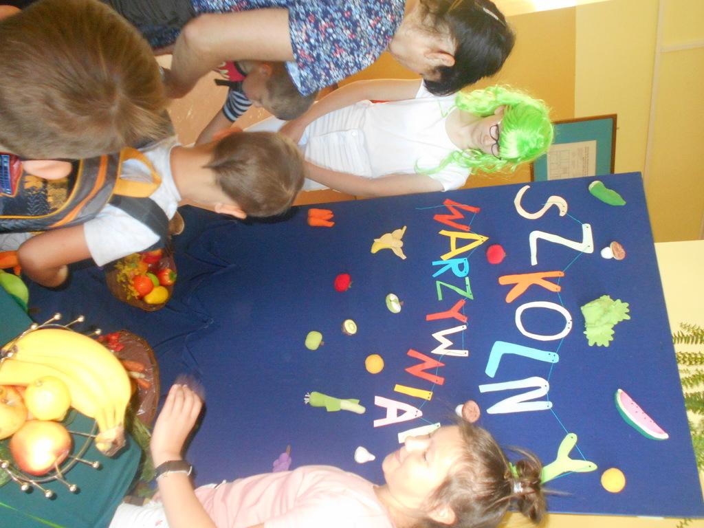 a) “Szkolny warzywniak”. Uczniowie przygotowali na korytarzu w szkole szkolny warzywniak. Przynieśli do szkoły warzywa i owoce, które najczęściej jedzą w swoim domach. W wiklinowych koszyczkach nie zabrakło: polskich jabłek, ziemniaków, marchewek, pietruszki, selera, pora oraz bananów. Uczniowie podczas przygotowań uzasadniali, dlaczego warto jeść warzywa i owoce.