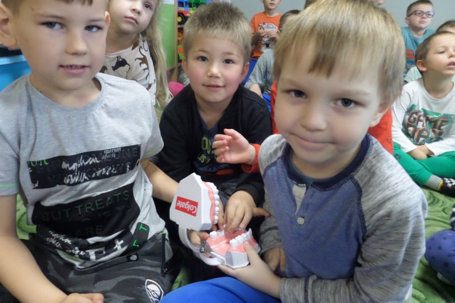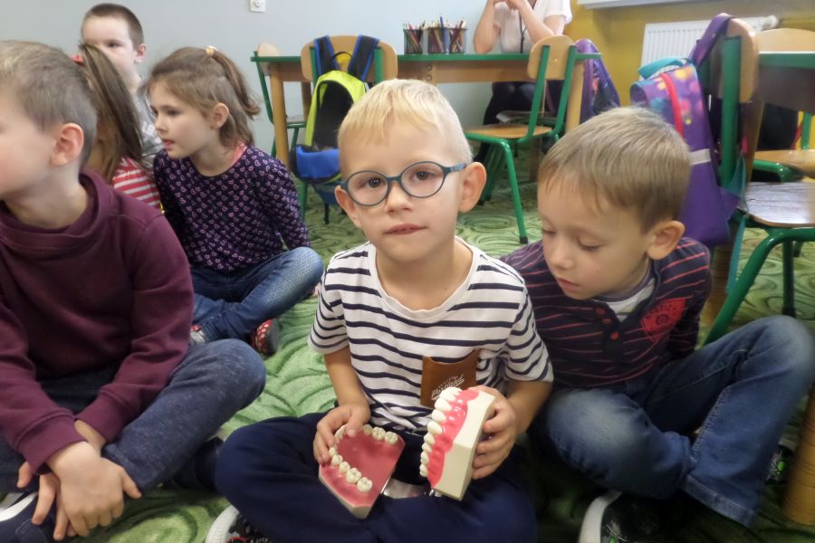 Po wspólnym powitaniu pani pielęgniarka zadała dzieciom zagadki o przyborach do mycia zębów, następnie rozpoczęła pogadankę na temat – kiedy myjemy zęby?, co powinniśmy jeść, aby mieć zdrowe zęby?, gdzie musimy się udać, gdy nas bolą zęby?, co to jest lakowanie zębów?. Kolejnym etapem spotkania był pokaz na modelu jamy ustnej, jak należy prawidłowo myć zęby. Wszystkie dzieci aktywnie uczestniczyły w spotkaniu, uważnie słuchały pani pielęgniarki a na zakończenie otrzymały kolorowe naklejki.
