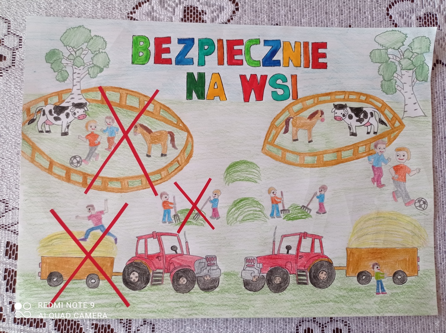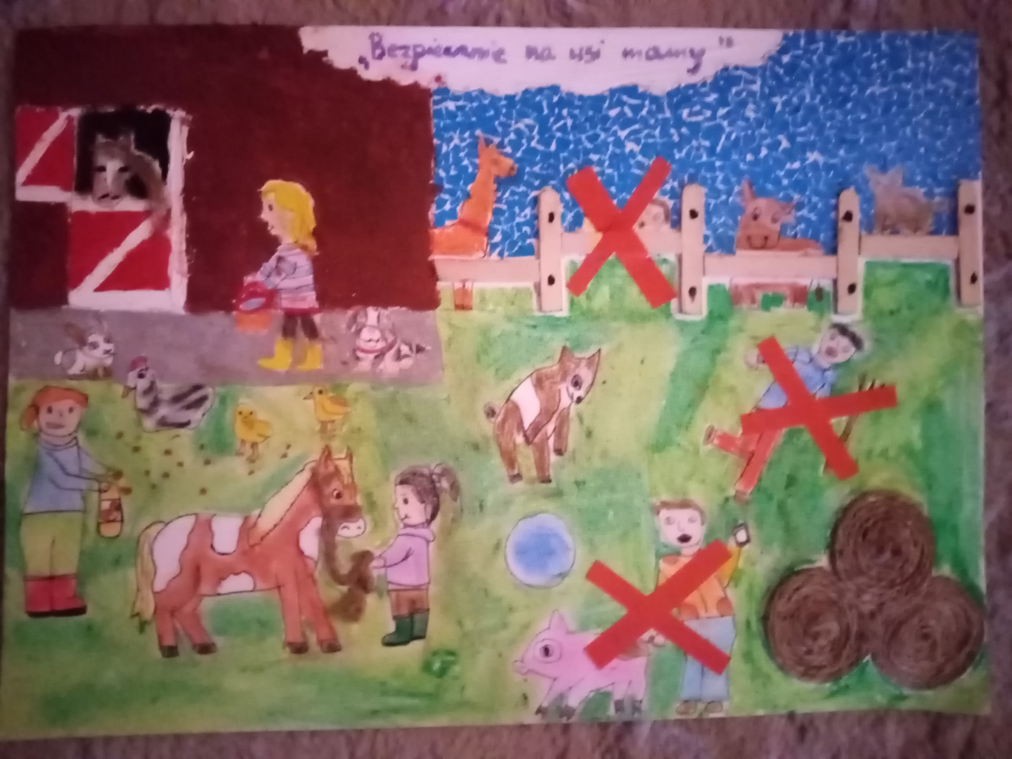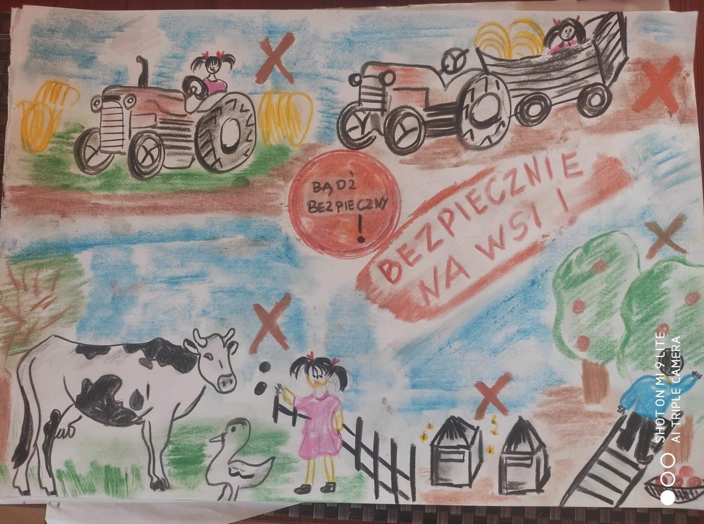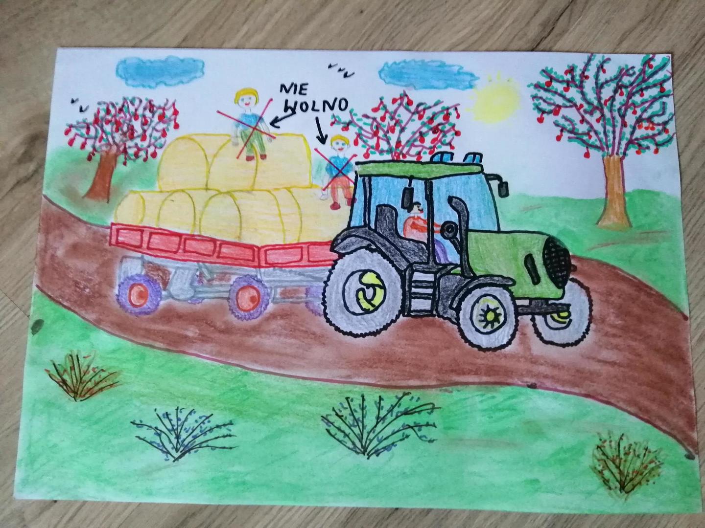 Uczniowie wykonali prace obrazujące sposoby zapobiegania wypadkom przy pracy w gospodarstwie rolnym oraz rolniczym chorobom zawodowym.
