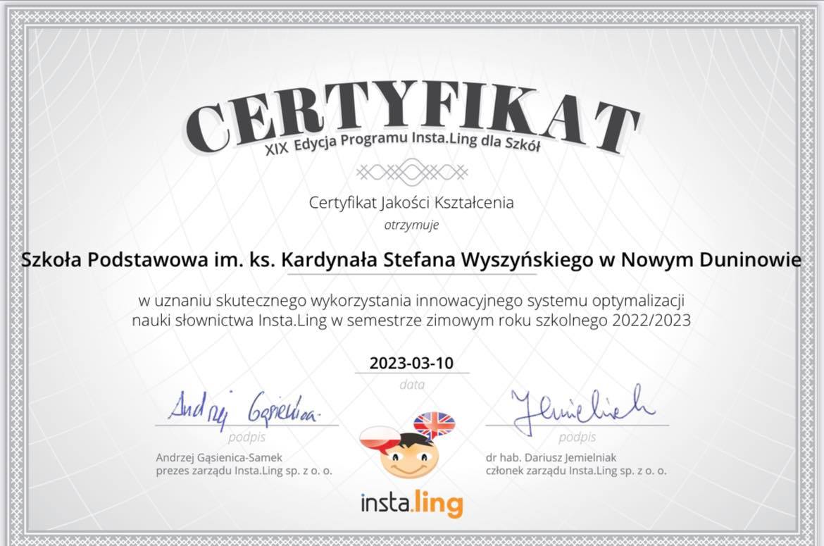 CERTYFIKAT JAKOŚCI DLA SZKOŁY ZA UDZIAŁ W PROGRAMIE OGÓLNOPOLSKIM Insta.ling DLA SZKÓŁ