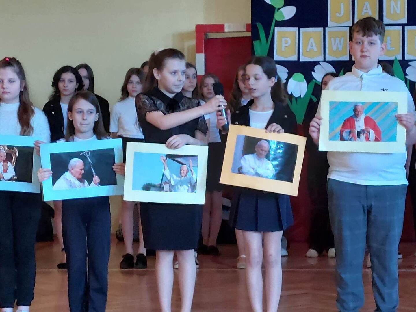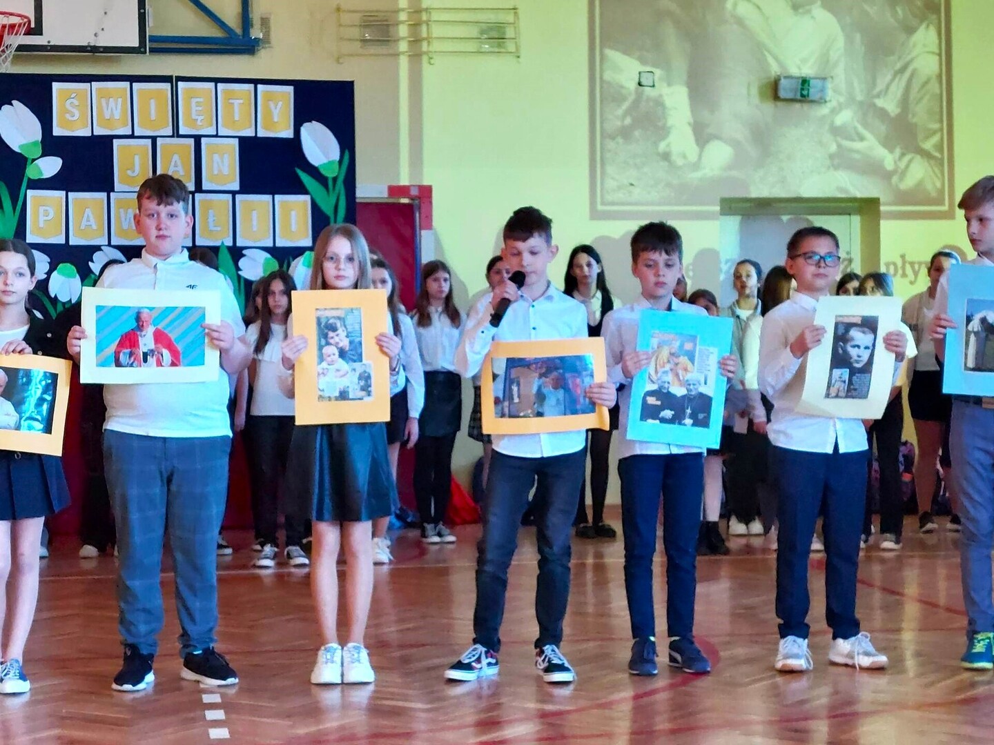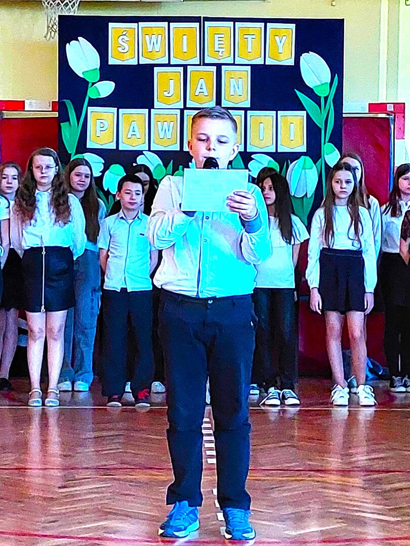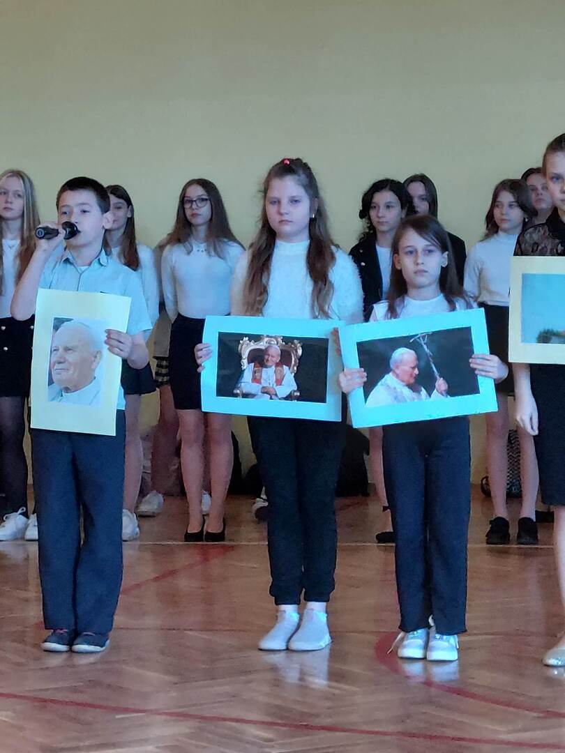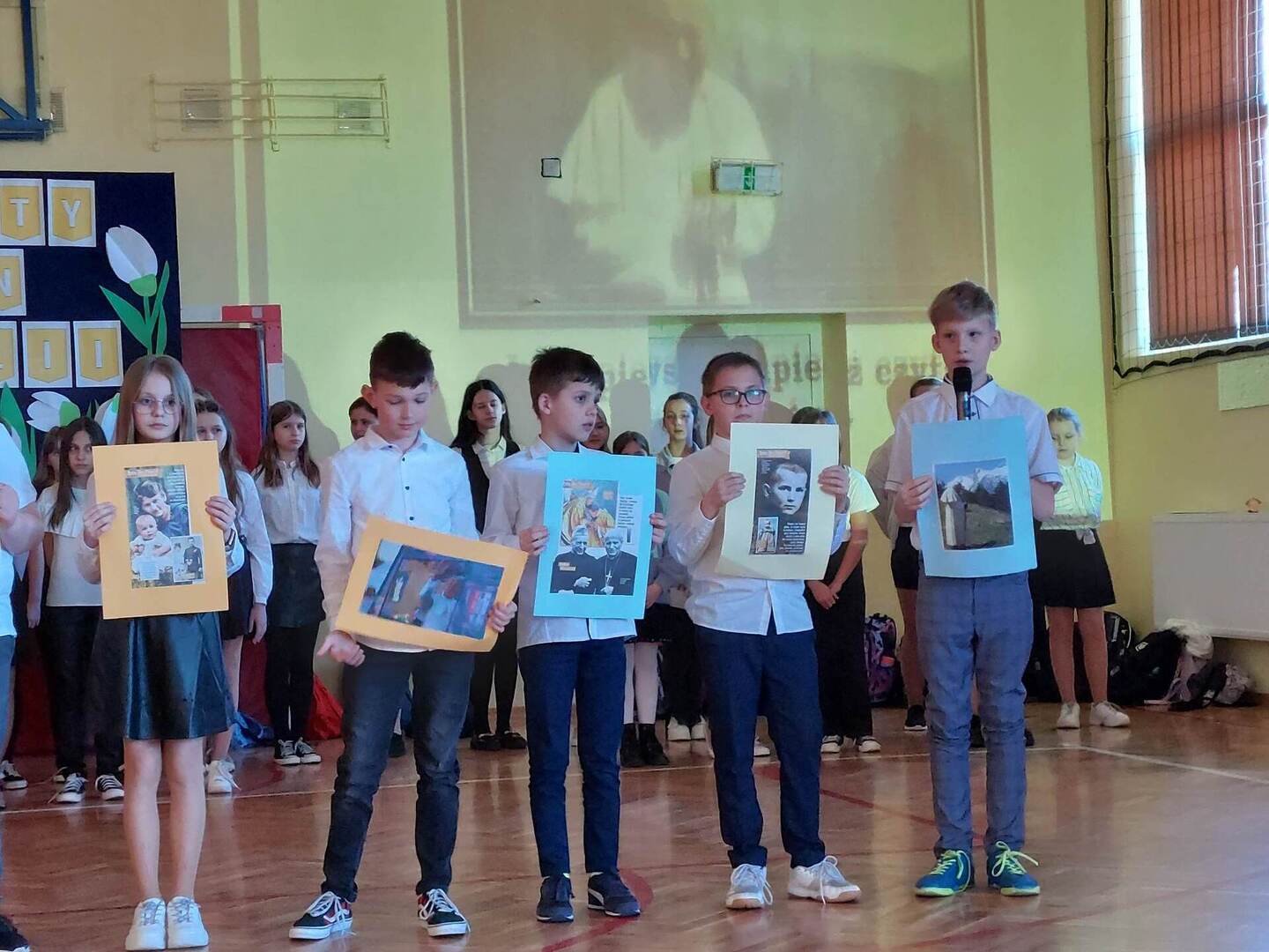 Młodzi artyści z klasy IVA i IVB zaprezentowali fakty z życia młodego Karola. W ten sposób najmłodsi uczniowie naszej społeczności szkolnej mogli poznać wyjątkową osobowość