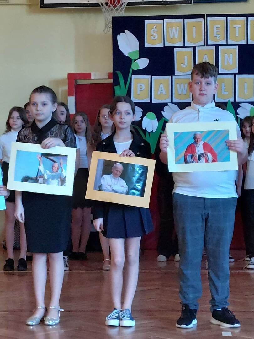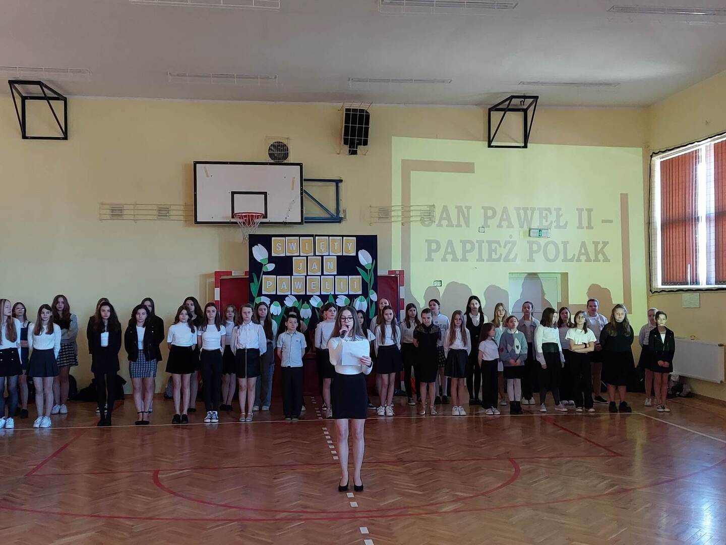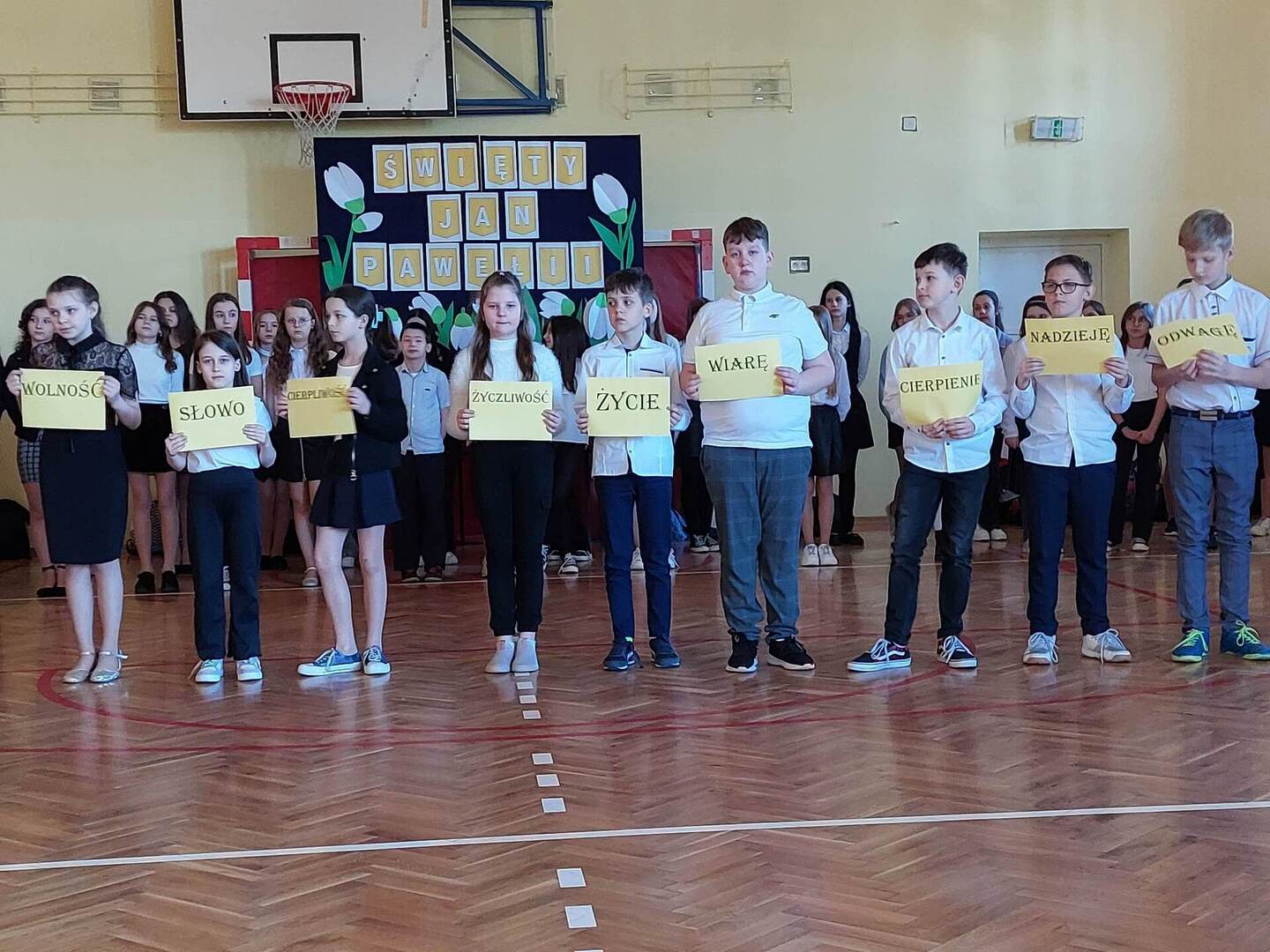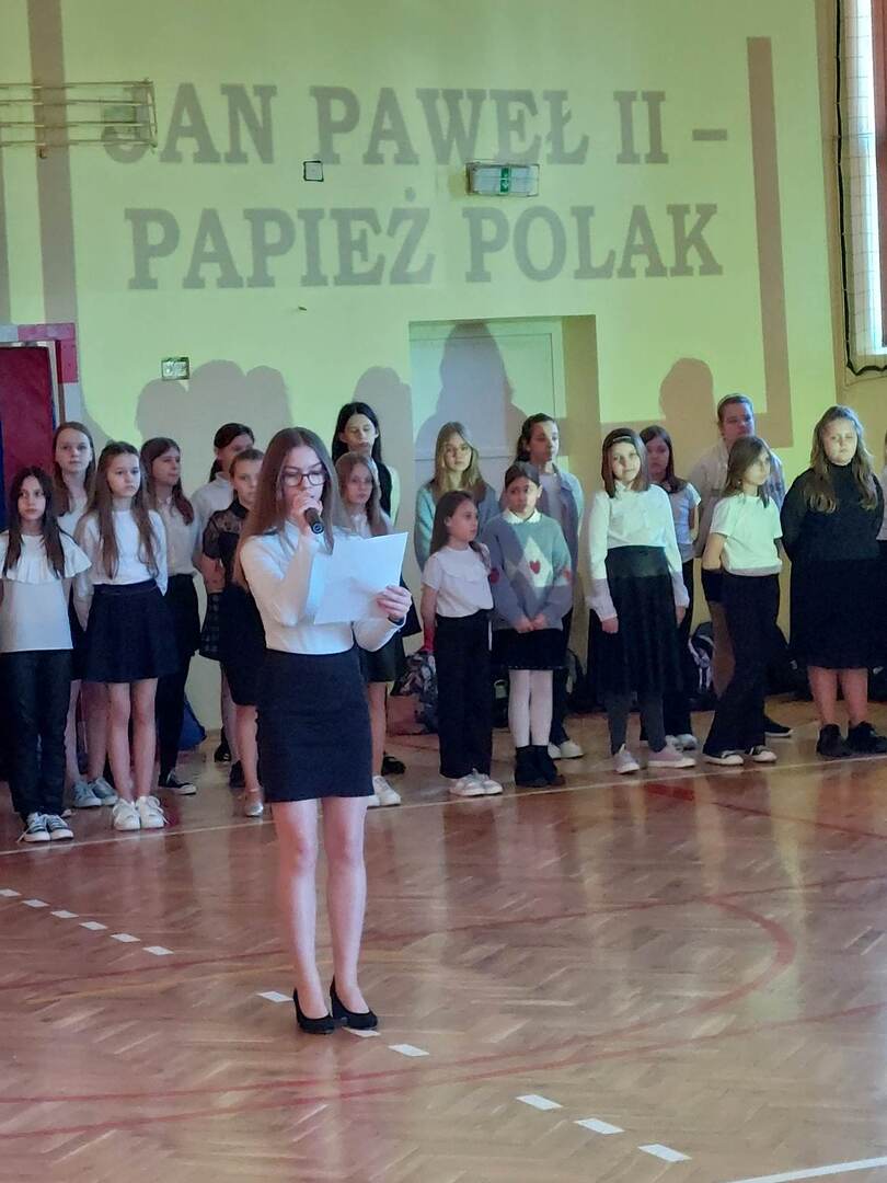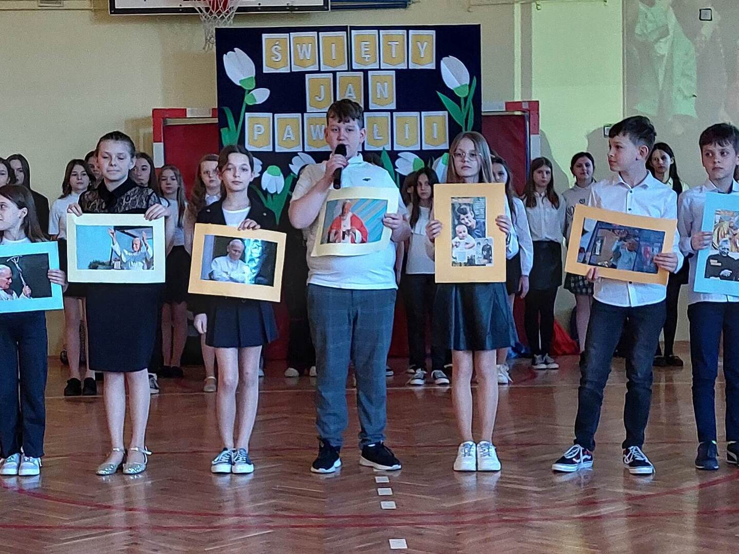 Młodzi artyści z klasy IVA i IVB zaprezentowali fakty z życia młodego Karola. W ten sposób najmłodsi uczniowie naszej społeczności szkolnej mogli poznać wyjątkową osobowość