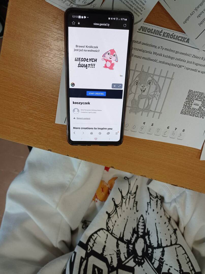 Gdy siódmoklasiści rozwiązali zadania - skanowali kod QR™ i sprawdzali w aplikacji, czy udało się im uwolnić króliczka. Na szczęscie króliczek wielkanocny został uwolniony!