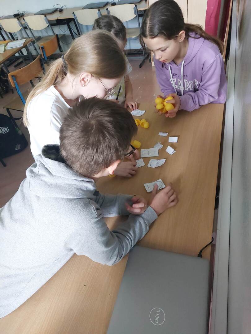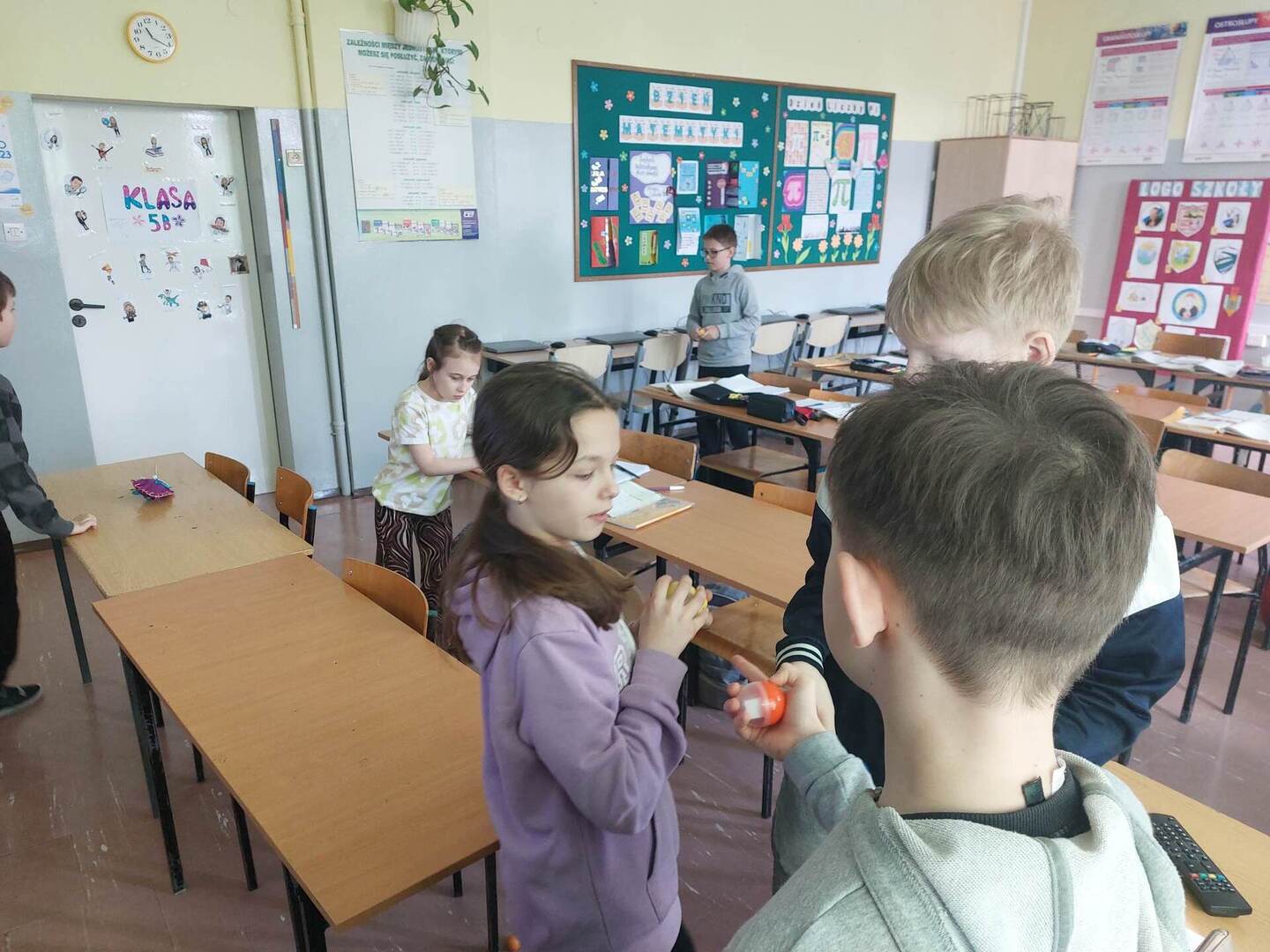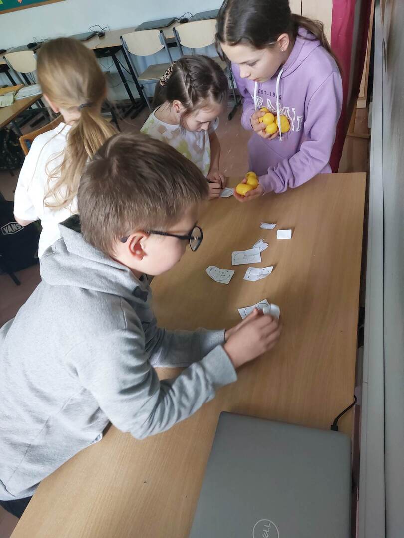 Uczniowie klasy Vb pomogli również króliczkowi i pokukrywali w sali 210 jajka z zadaniami dla młodszych kolegów z klasy IVb, którzy podczas lekcji matematyki pracowali w grupach rozwiązując wielkanocne zadania.