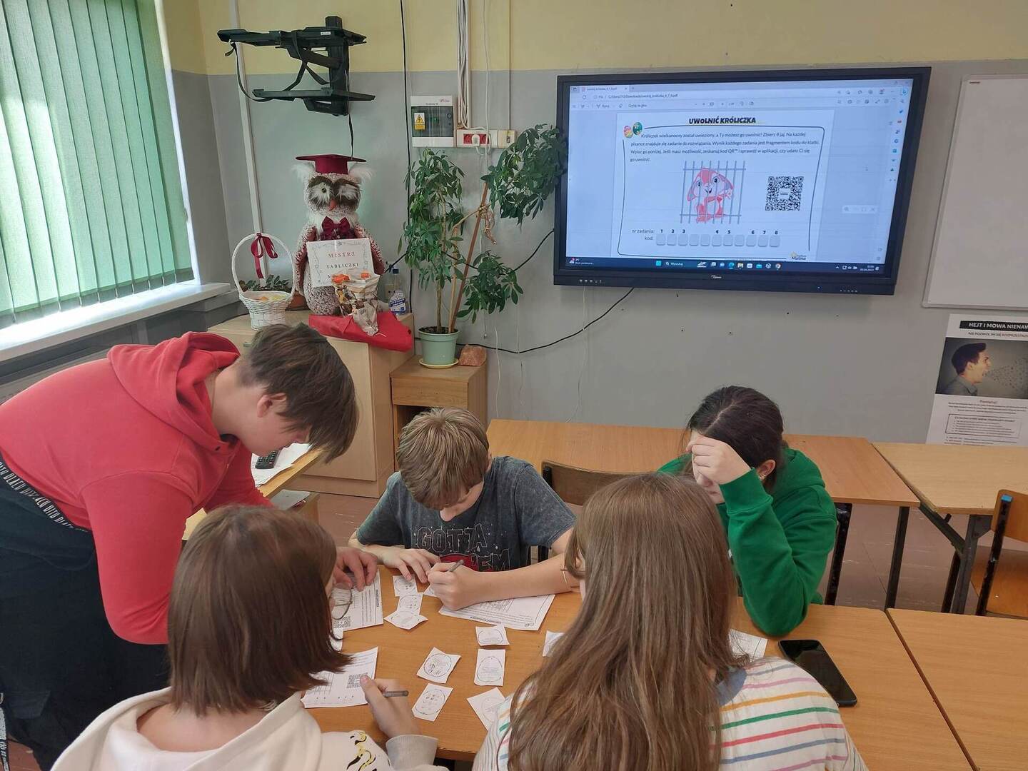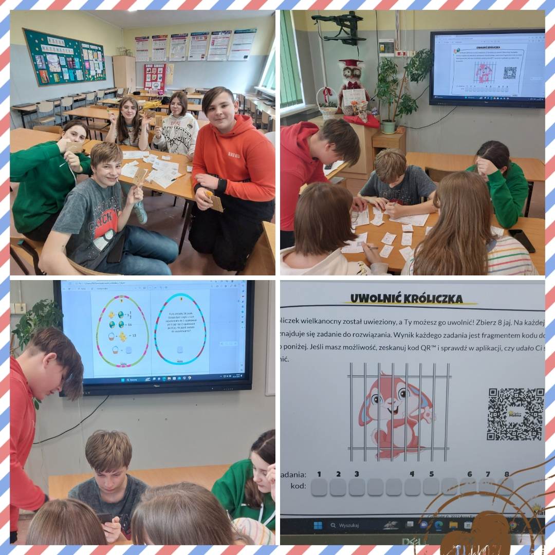 Uczniowie klasy siódmej mieli trudniejsze zadanie, ponieważ musieli uwolnić wielkanocnego króliczka. Na każdej pisance znajdowało się zadanie do rozwiązania. Wynik każdego zadania był fragmentem kodu do klatki.