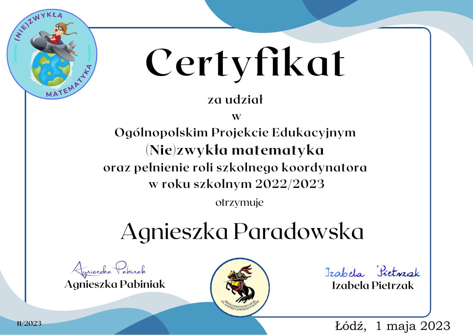 Projekt z uczniami realizowała Pani Agnieszka Paradowska. Szkołą otrzymała certfikat za udział w projekcie.